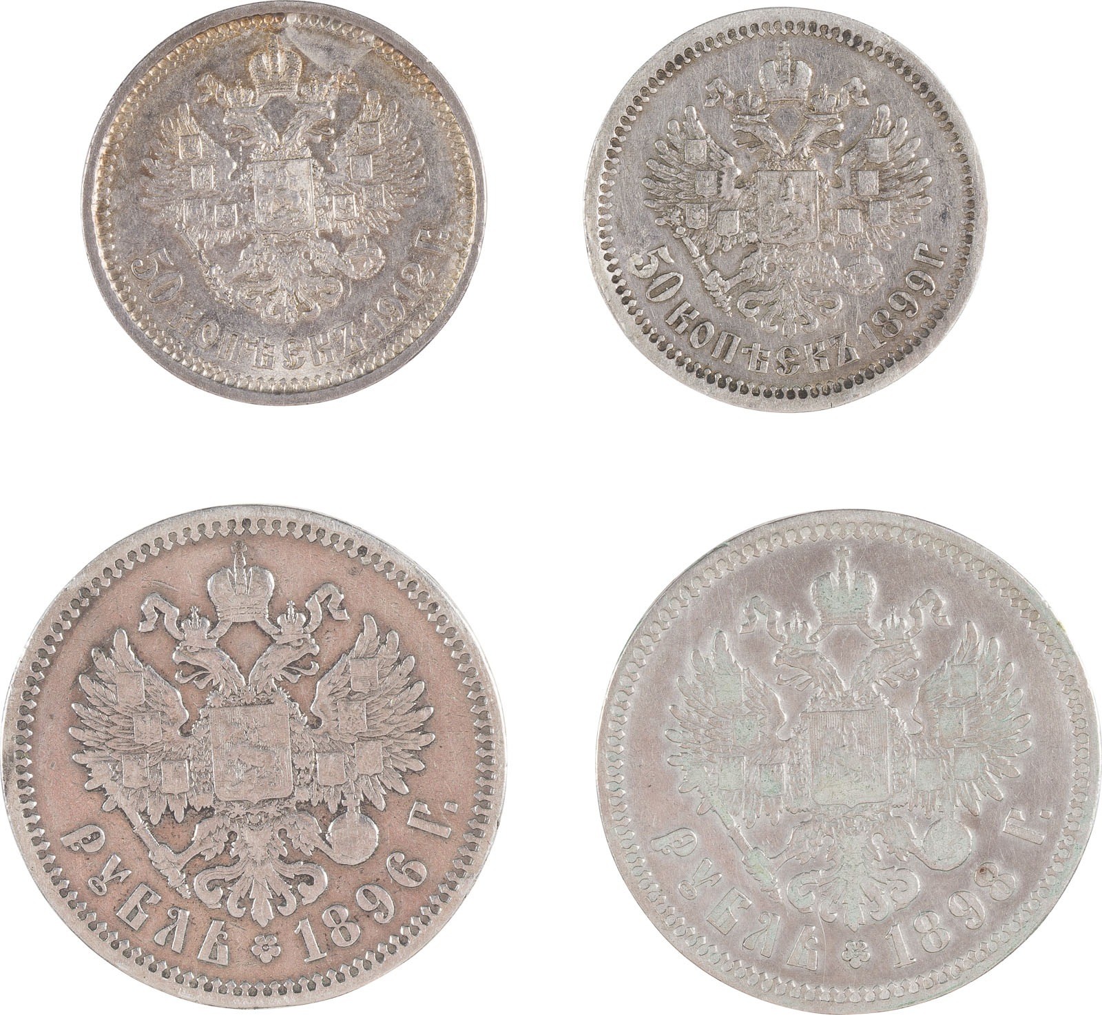 FOUR COINS WITH A PORTRAIT OF NICHOLAS II Russian, 1896/1898/1899/1912 Silver. Diam. 2.8-3.5 cm, 59.4 gr (in total).