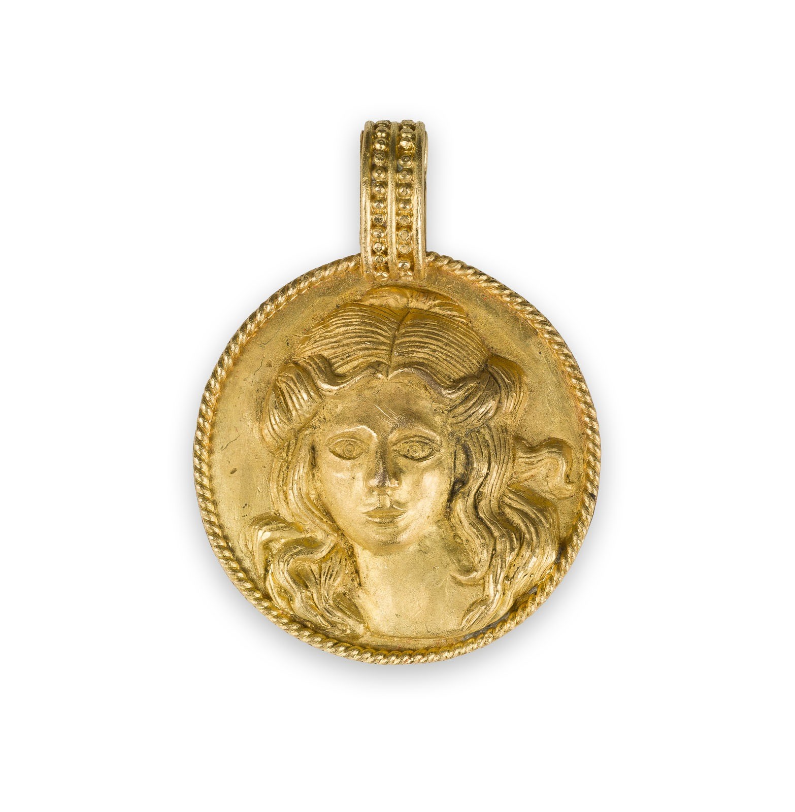 A GOLD PENDANT WITH A FEMALE PORTRAIT In the Skythian style 875 gold. Embossed in relief. 3.7 cm long, 16 gr.