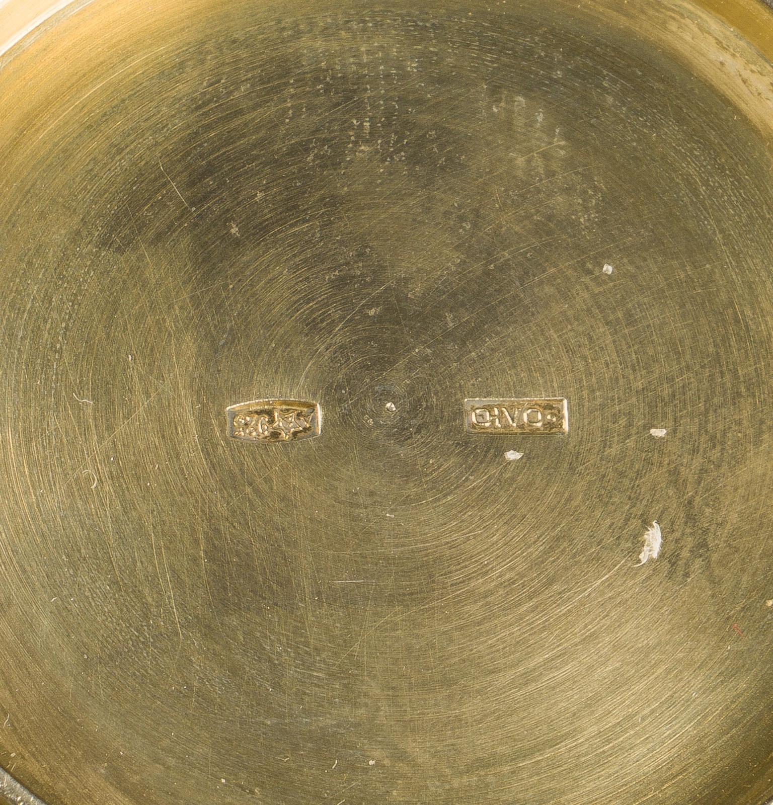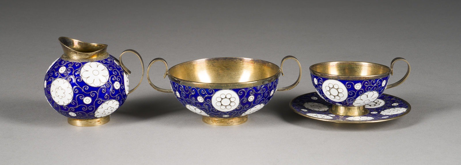 A SILVER-GILT AND CLOISONNÉ ENAMEL CUP WITH SAUCER, SUGAR BOWL AND CREAM JUG Soviet Union, Leningrad, after 1958 The bodies decorated with stylized flowers in white on blue ground. Marked with assayer's mark, 925 standard and master's mark. 4-5.7 cm high, 365 gr.