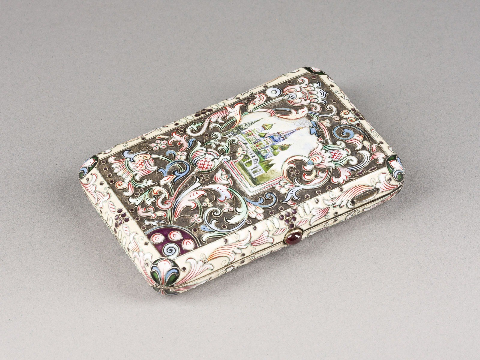 A SILVER AND CLOISONNÉ ENAMEL CIGARETTE CASE Russian, Moscow, Fedor Rückert, 1896-1908 Rectangular form with rounded corners. The lid decorated with shaded polychrome cloisonné enamel foliate scrolls over a pond. The lid painted en plein with an architectural view of the Saint Basil's Cathedral. Marked with assayer's mark, 84 standard and master's mark 'F.R.' in Cyrillic. Enamel minimally chipped. 10.8 cm long, 177 gr.