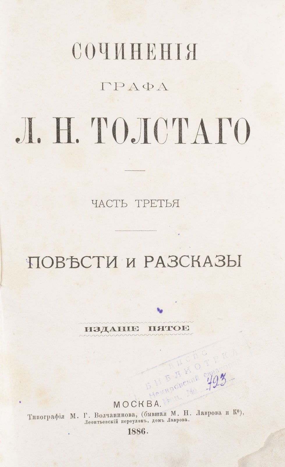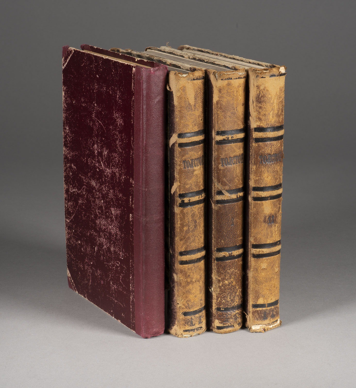 THE WORKS OF COUNT L.N. TOLTOY IN THREE VOLUMES AND 'LOVE AND DEATH' BY E. CARPENTER Russian, Moscow/Petrograd, printed by M.G. Volchanov/published by M.W. Pirozhkov, 1886/1917 In Russian language. Partially torn, covers partially rubbed. 21.5/22 cm high.