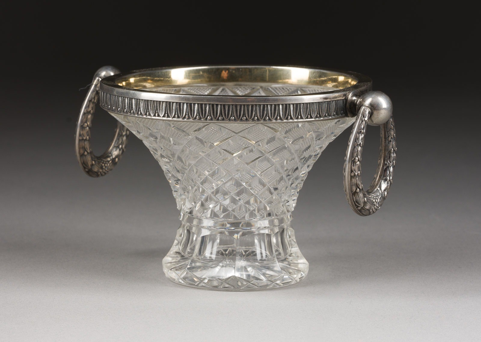 A SILVER-MOUNTED CUT-GLASS BOWL Russian, Moscow, Fabergé, 1908-1917 Of circular form. The glass body cut with diaper patterns, the silver mount with two handles formed of hung laurel festoons. Marked with assayer's mark, 88 standard and master's mark 'K.F.' in Cyrillic. 8.4 cm high.