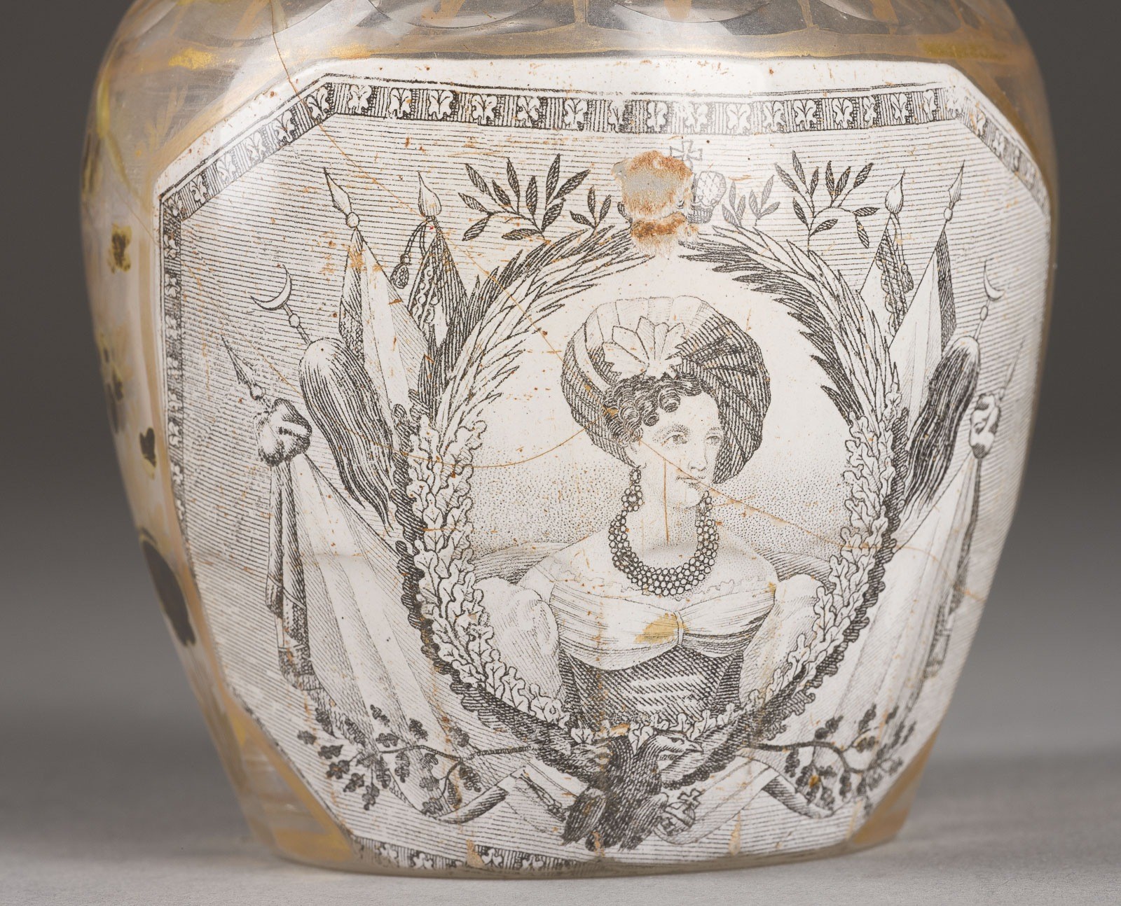 A FINE GLASS DECANTER DEPICTING PORTRAITS OF EMPEROR NICHOLAS I AND EMPRESS ALEXANDRA FEODOROVNA WITH NINE FOOTED BEAKERS A.o. Russian, St. Petersburg, Imperial Glass Factory, 1830-40s Colourless, faceted/cut glass, lithography, gold and silver painting. Small glass jug with silver mount included. Partially restored. 8-17 cm high.