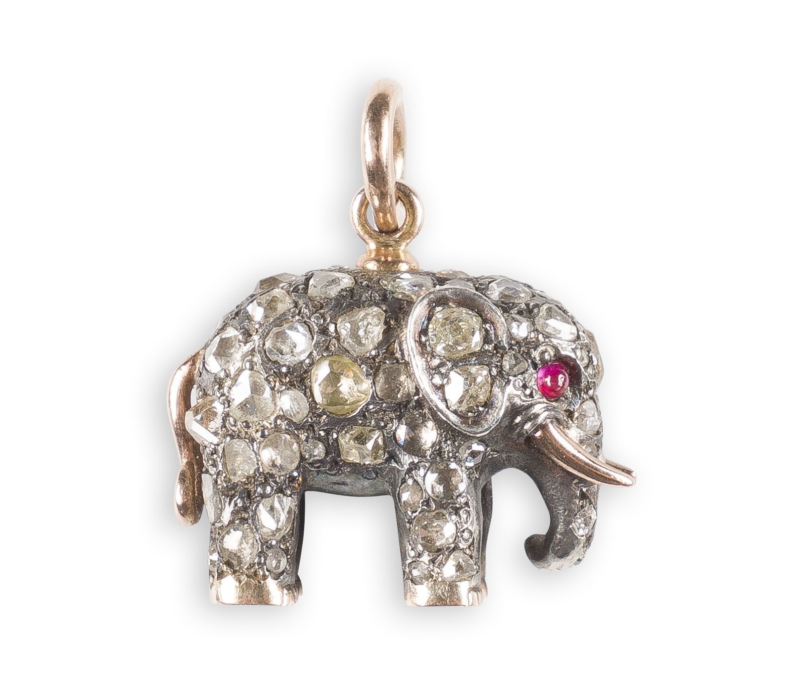 A FINE PENDANT IN THE FORM OF AN ELEPHANT Russian, St. Petersburg, Erik Kollin, 1899-1903 Gold, set with rose-cut diamonds and diamonds of 8/8-cut, together weighing approx. 3 ct., mounted in silver, with cabochon ruby eyes. Struck with assayermark, 56 standard and workmaster's mark EK. 1.8 cm long, 11 gr.