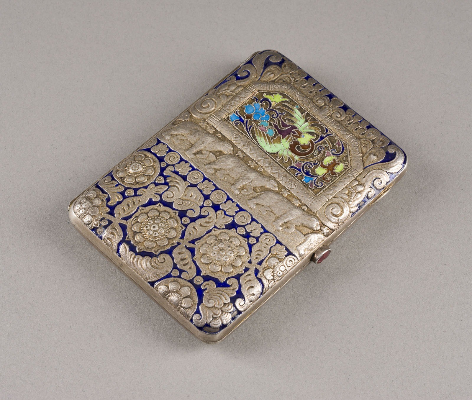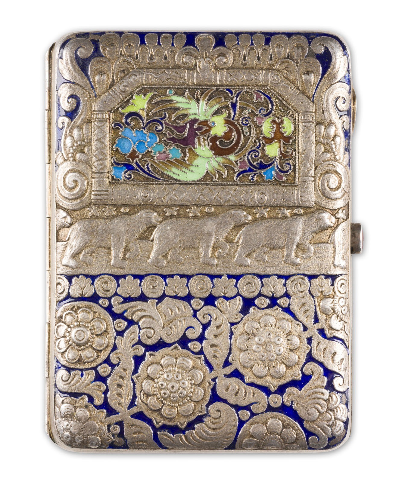 A FINE CLOISONNÉ ENAMEL CIGARETTE CASE Russian, Moscow, Dmitriy Nikolaev, 1908-1917 The cover repoussé and chased with polar bears and Pan-Slavic floral ornament and a bird in multicolor enamels, interior gilded, red glass cabochon thumbpiece and enamel minimaly chipped. Struck with assayer's mark, 84 standard and workmaster's initials 'DN' in Cyrillic. 10.6 cm long, 212 gr.