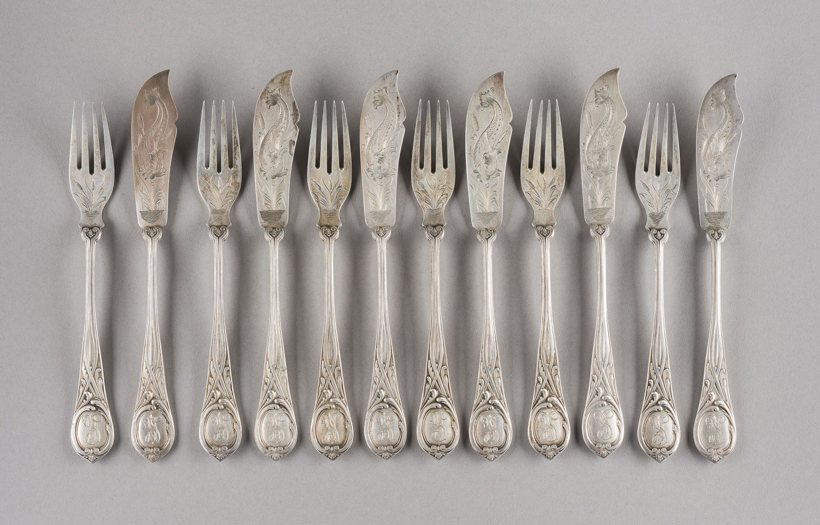 A SILVER FISH KNIVE AND FORK SET Russian, St. Petersburg, Grachev Brothers, 1896-1908 Comprising six knives and six forks finely chased with fish, the handles with foliate ornament, with engraved initials 'LK'. Marked with assayer's mark, 84 standard and master's mark 'GRATCHEV' in Cyrillic with Imperial warrant. 18.2 / 19.5 cm long, 570 gr.