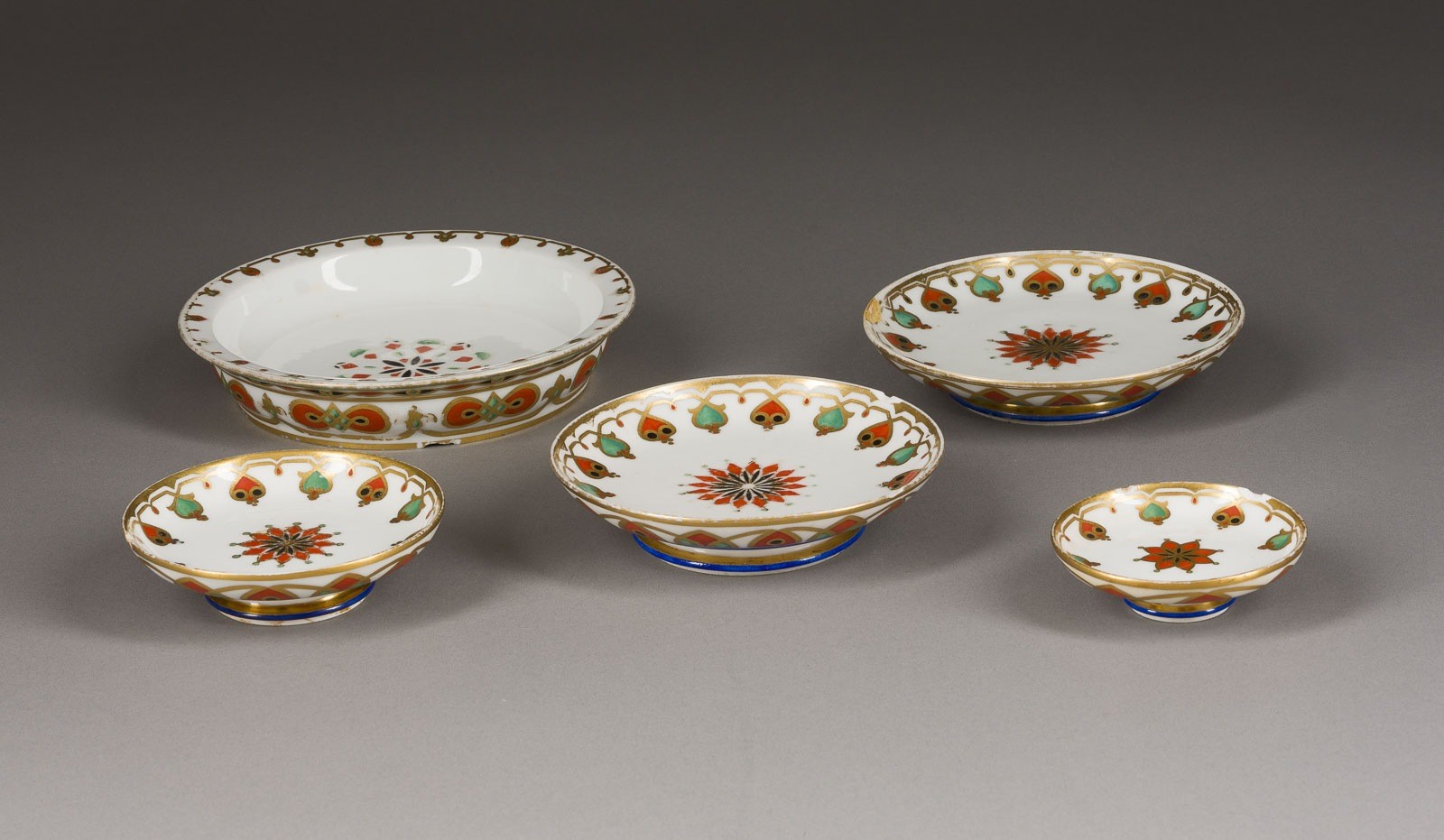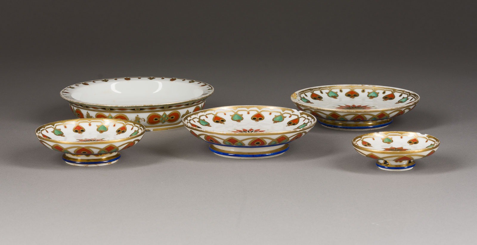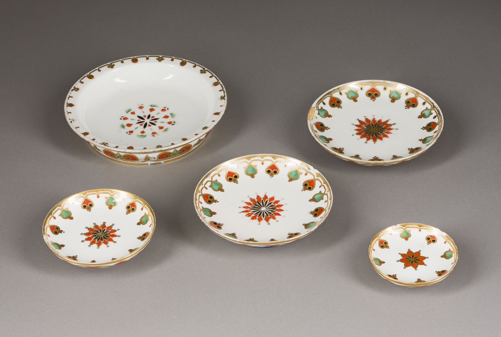 A SET OF FIVE SMALL PLATES FROM THE SERVICE OF GRAND DUKE KONSTANTIN NIKOLAEVICH Russian, St. Petersburg, Imperial Porcelain Factory, 1848-1852 Ornamentally painted, gilded rims. The ceremonial service was designed by F.G. Solntsev for the wedding of the Grand Duke and the Princess of Saxe-Altenburg, the future Grand Duchess Alexandra Iosifovna. Partially slightly chipped, paint partially slightly rubbed. Diam. 8.8-18.1 cm.