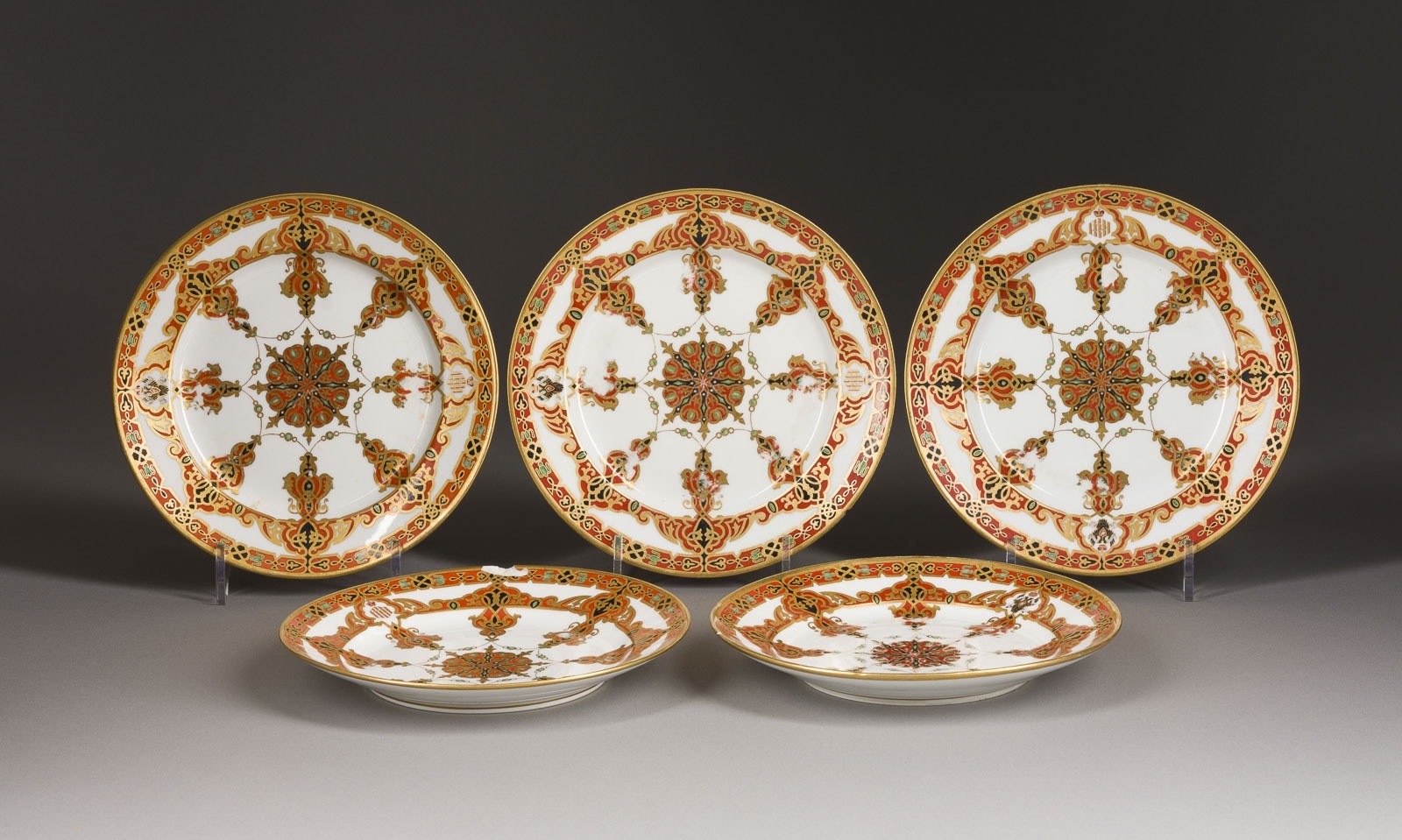 A SET OF FIVE PORCELAIN PLATES FROM THE SERVICE OF GRAND DUKE KONSTANTIN NIKOLAEVICH Russian, St. Petersburg, Imperial Porcelain Factory, Period of Nicholas I, 1848-1852 Ornamentally painted, gilded rims. Underglaze blue factory mark 'NI' under the crown, partially with Cyrillic marks 'F', '56', or '64.' in gold, partially with stamp '54'. Decorated with the Grand Duke's monogram in Cyrillic 'WKKN' and with the imperial double-headed eagle. The ceremonial service was designed by F.G. Solntsev for the wedding of the Grand Duke and the Princess of Saxe-Altenburg, the future Grand Duchess Alexandra Iosifovna. Paint slightly rubbed, one plate slightly chipped. Diam. 22-22.6 cm.