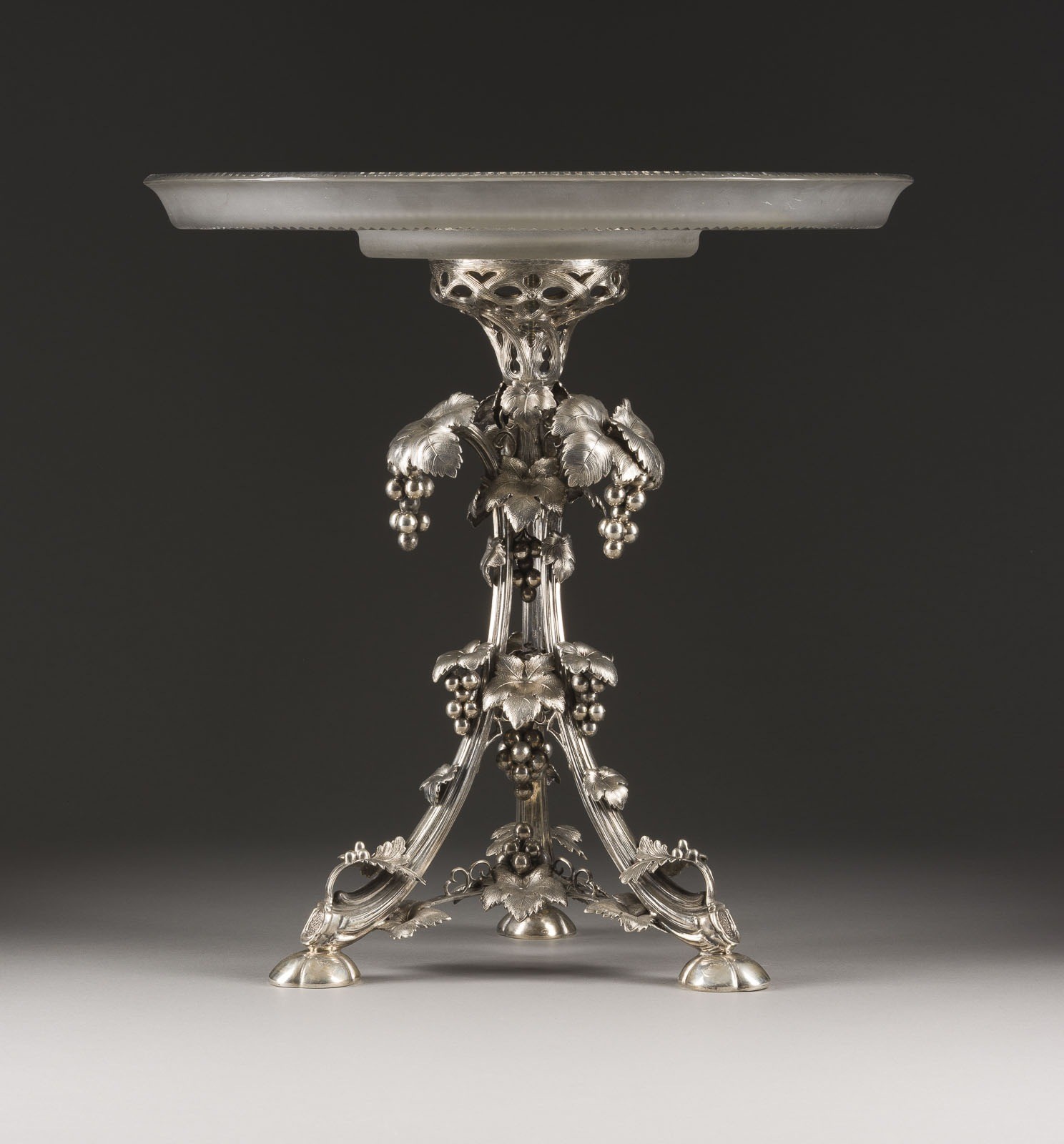 A LARGE SILVER AND GLASS TAZZA WITH GRAPES Late 19th century Silver, cast and chased, with colourless partly frosted glass. Struck with Odessa import mark for 84 standard. 40 cm high.