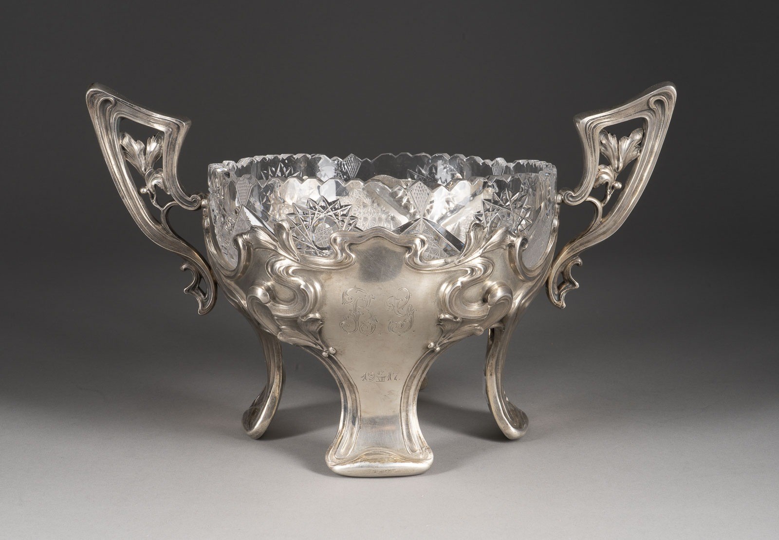 A LARGE ART NOUVEAU BOWL WITH TWO HANDLES Russian, Moscow, 4th Artel, 1908-1917 The glass body cut with star-shaped and ray patterns. The silver mount chased with scrolls and foliage motifs, flanked by two foliage handles chased and engraved in the Art Nouveau style. Marked with assayer's mark, 84 standard and master's mark '4MA'. 22.7 cm high, 1336 gr.