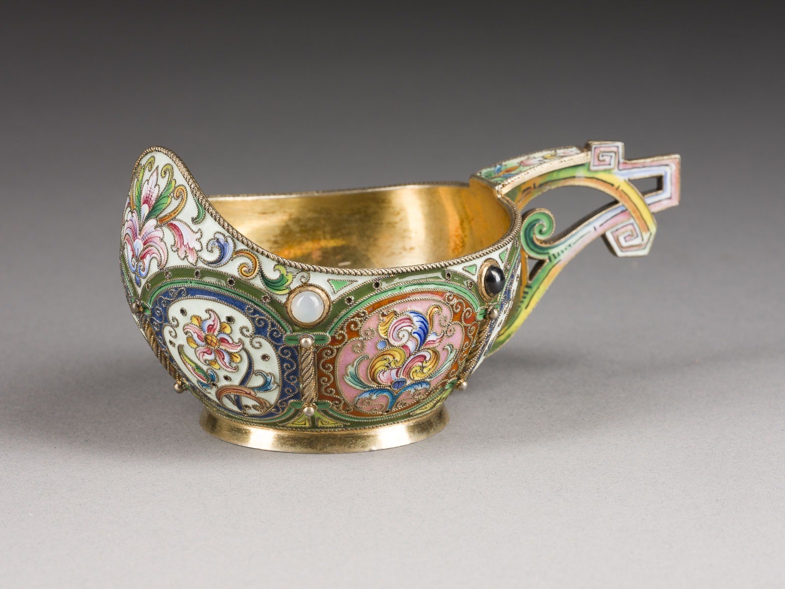 A LARGE ART NOUVEAU CLOISONNÉ ENAMEL KOVSH Russian, Moscow, Orest Kurlyukov, 1908-1917 In Art Noveau taste, decorated with six medallions of polychrome flowers on cream ground and divided by pilasters, amethysts and yellow garnets, openwork handle. Marked under base with assayer's mark, 84 standard, master's mark 'O KURLYUKOV' in Cyrillic, with later Soviet control mark. 11 cm long, 102 gr.