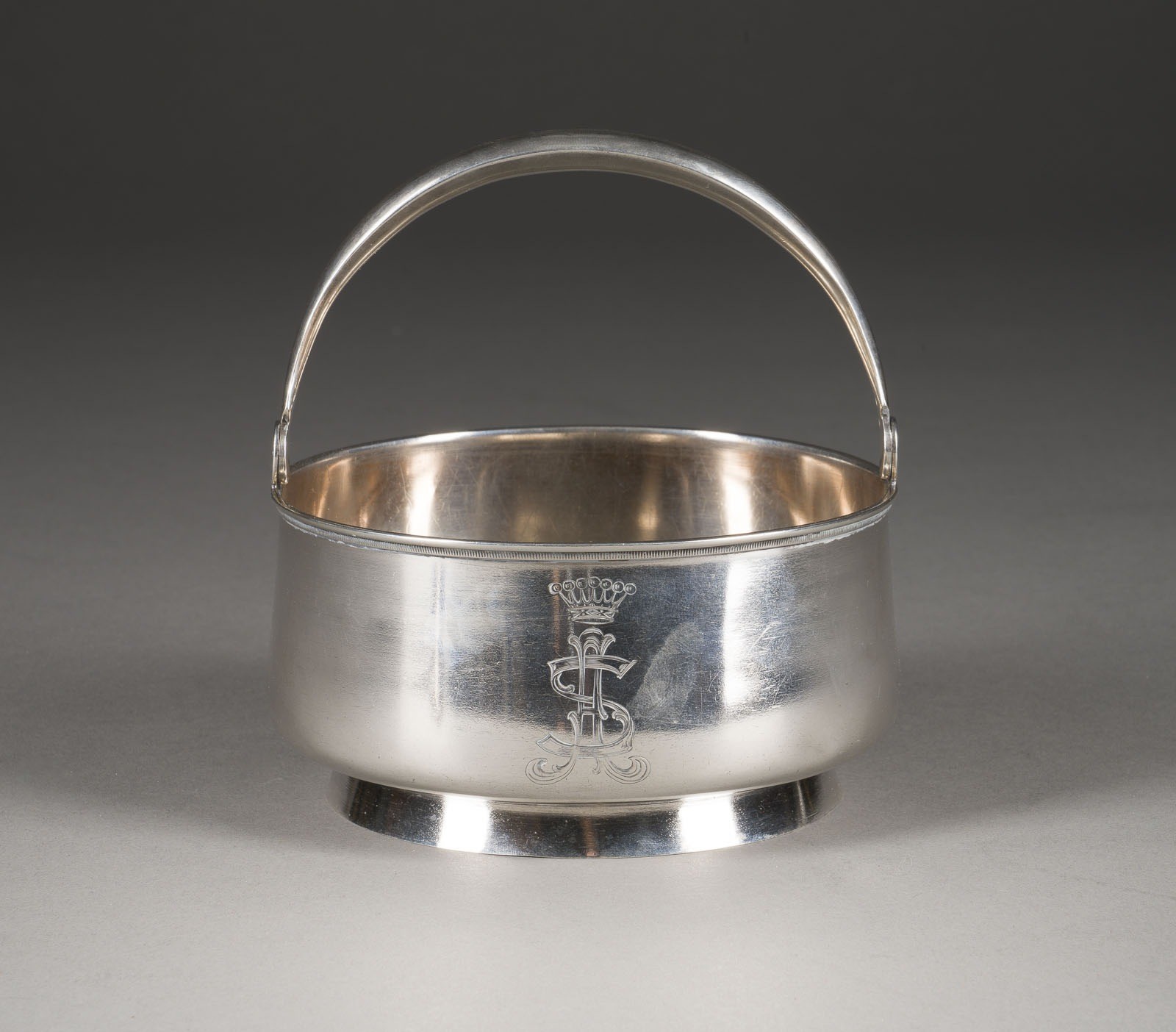 A SILVER BOWL WITH HANDLE Russian, Moscow, Vasily Igorovitch Rukavishnikov, 1908-1917 Of circular form. The body engraved with initials 'SA' in Cyrillic. Marked with assayer's mark, 84 standard and master's mark 'VR' in Cyrillic. Minor dents. Diam. 11 cm, 199 gr.