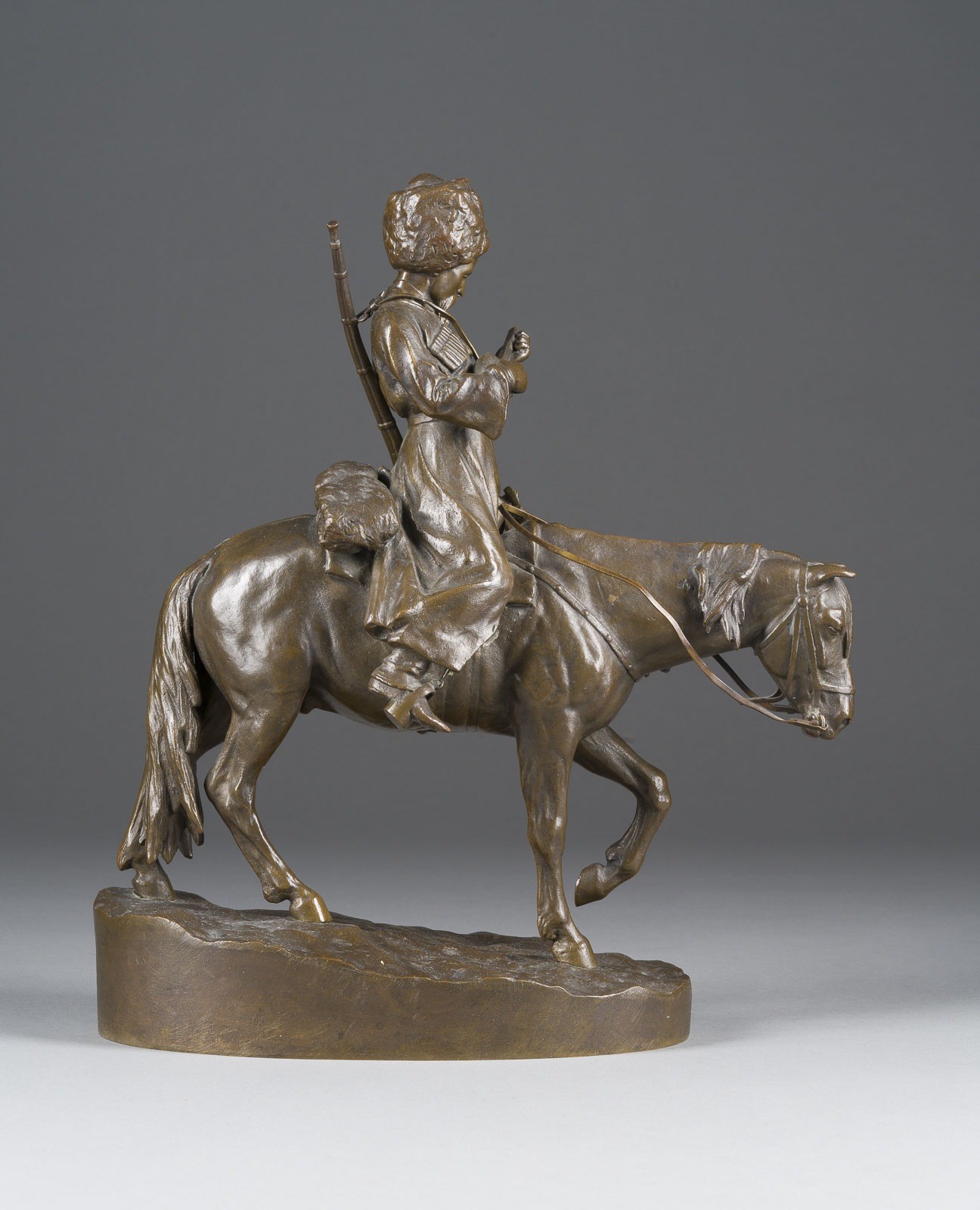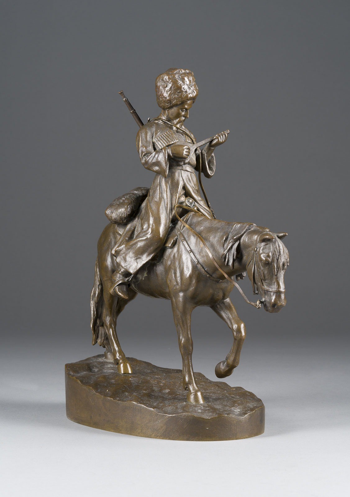 ALBERT MORITZ WOLFF 1854 Berlin - 1923 Lüneburg A BRONZE GROUP OF A COSSACK ON THE HORSEBACK WITH A KOBZA German, early 20th century Realistically cast and chiselled, brown patina. Inscr. in Cyrillic and dated on the base 'M. Wolf 1893'. Depiction of a Cossack sitting on a trotting horse in traditional costume with a fur hat, his gaze lowered while playing the Ukrainian lute, the kobza. 31 cm high.
