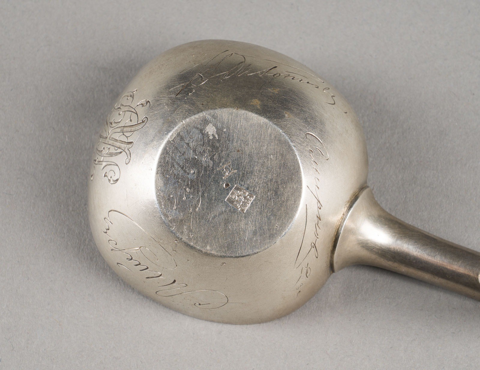 A SILVER KOVSH WITH MONOGRAM AND SIGNATURES Russian, St. Petersburg, 1895 Of traditional form. The body engraved with initials and signatures. Marked under base with city hallmark, assayer's mark, 84 standard and master's mark. 9.7 cm long, 49 gr.