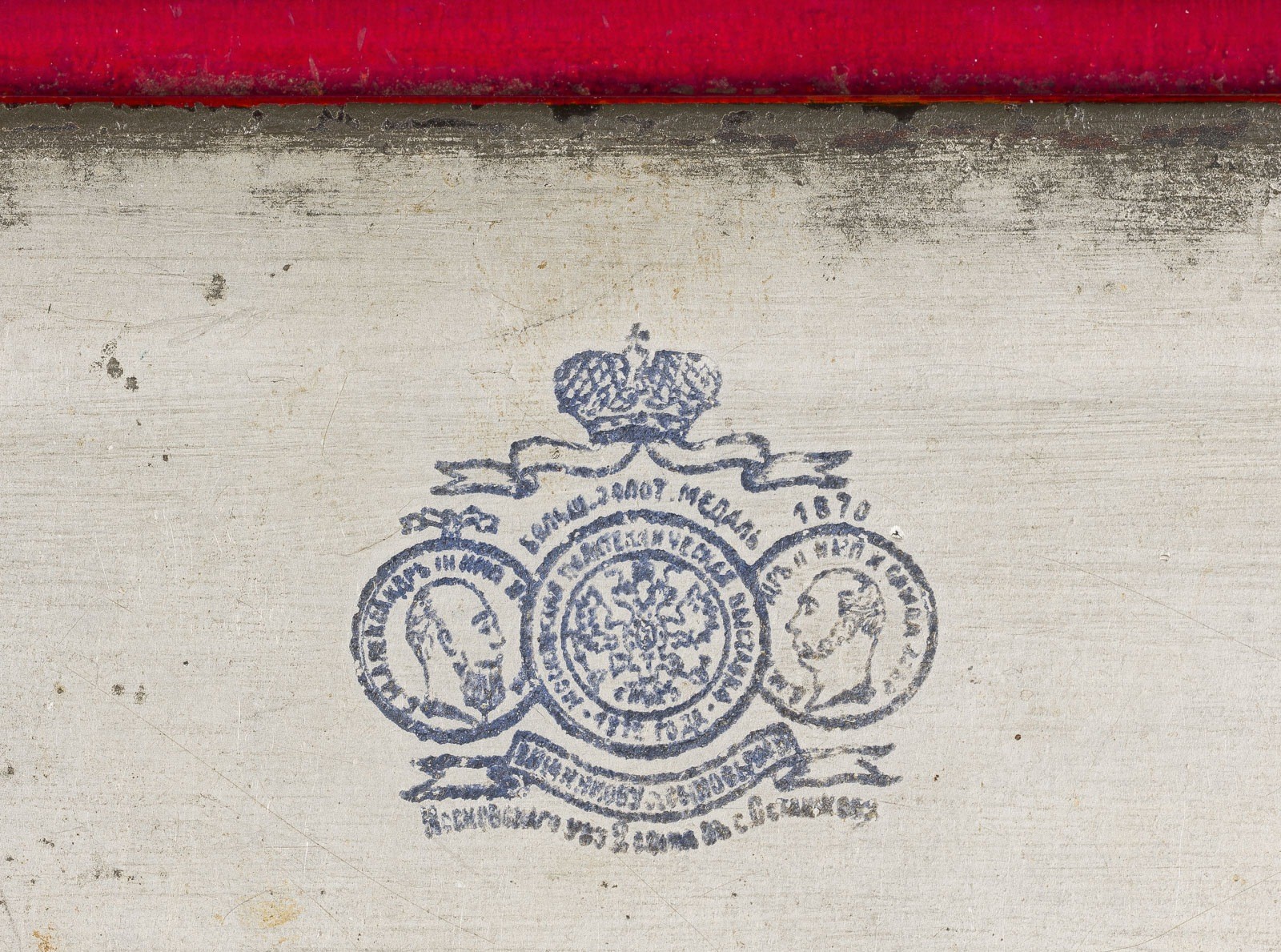 A PAPIER-MACHÉ AND LACQUER BOX SHOWING DANCING PEASANTS Russian, Ostashkovo, O. Vishnyakov and Sons Factory, 1882-1888 Painted, of rectangular form. Marked inside lid with three firm´s medallions under the crown. 17.8 cm long.