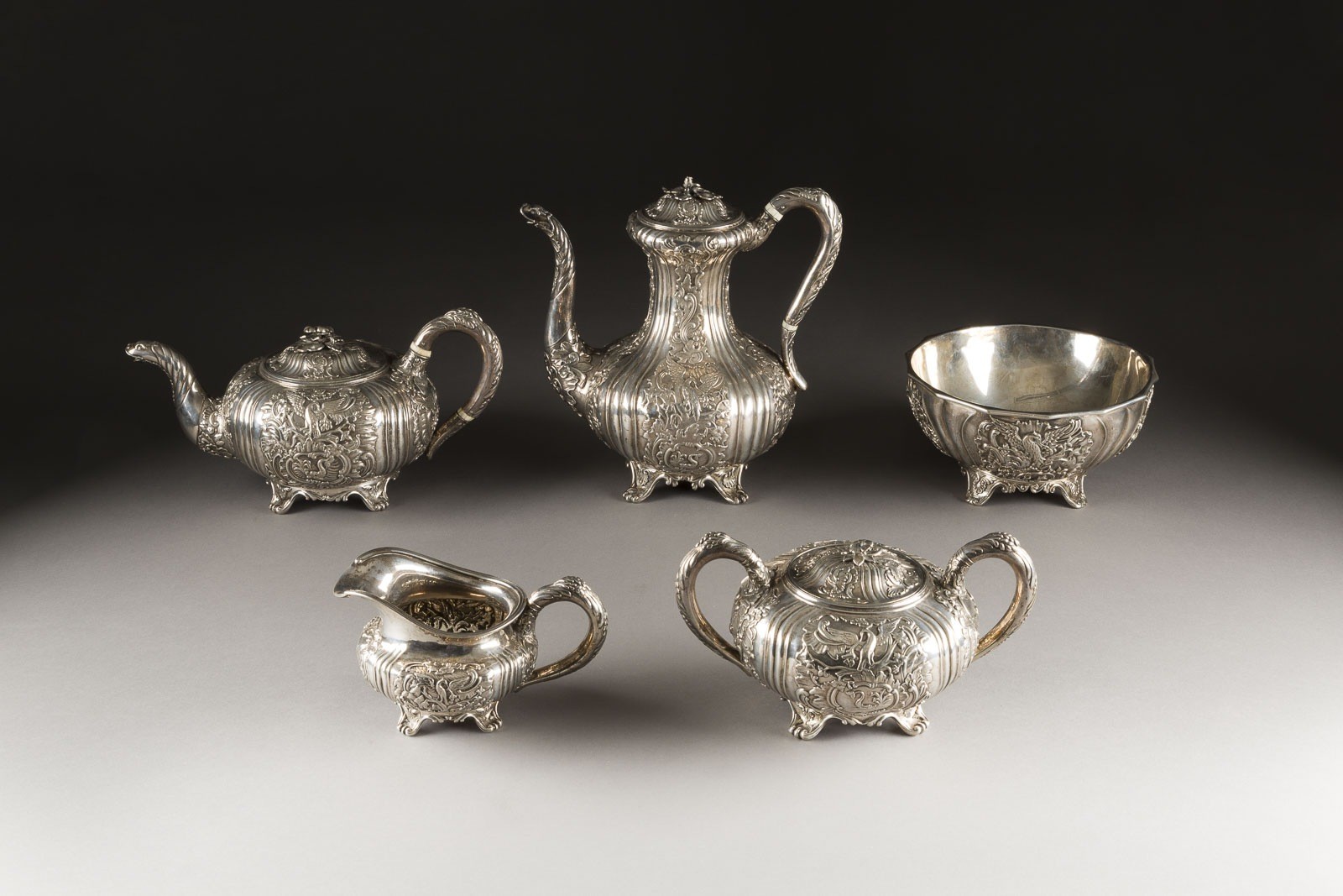 A MASSIVE SILVER COFFEE AND TEA SERVICE Russian, St. Petersburg, Gustav Adolf Petrell, 1843 Comprising a coffee pot, hot milk pot, teapot, sugar pot and waste bowl. The spherical bodies wirling fluted with chased bands of scrolls and emblematic eagles within floral cartouches. The finials in the form of flowers, the spout in the form of a fish head. Marked under base with city hallmark, assayer's mark, 84 standard and master's mark 'G.P'. 10-24.4 cm high, 4365 gr.