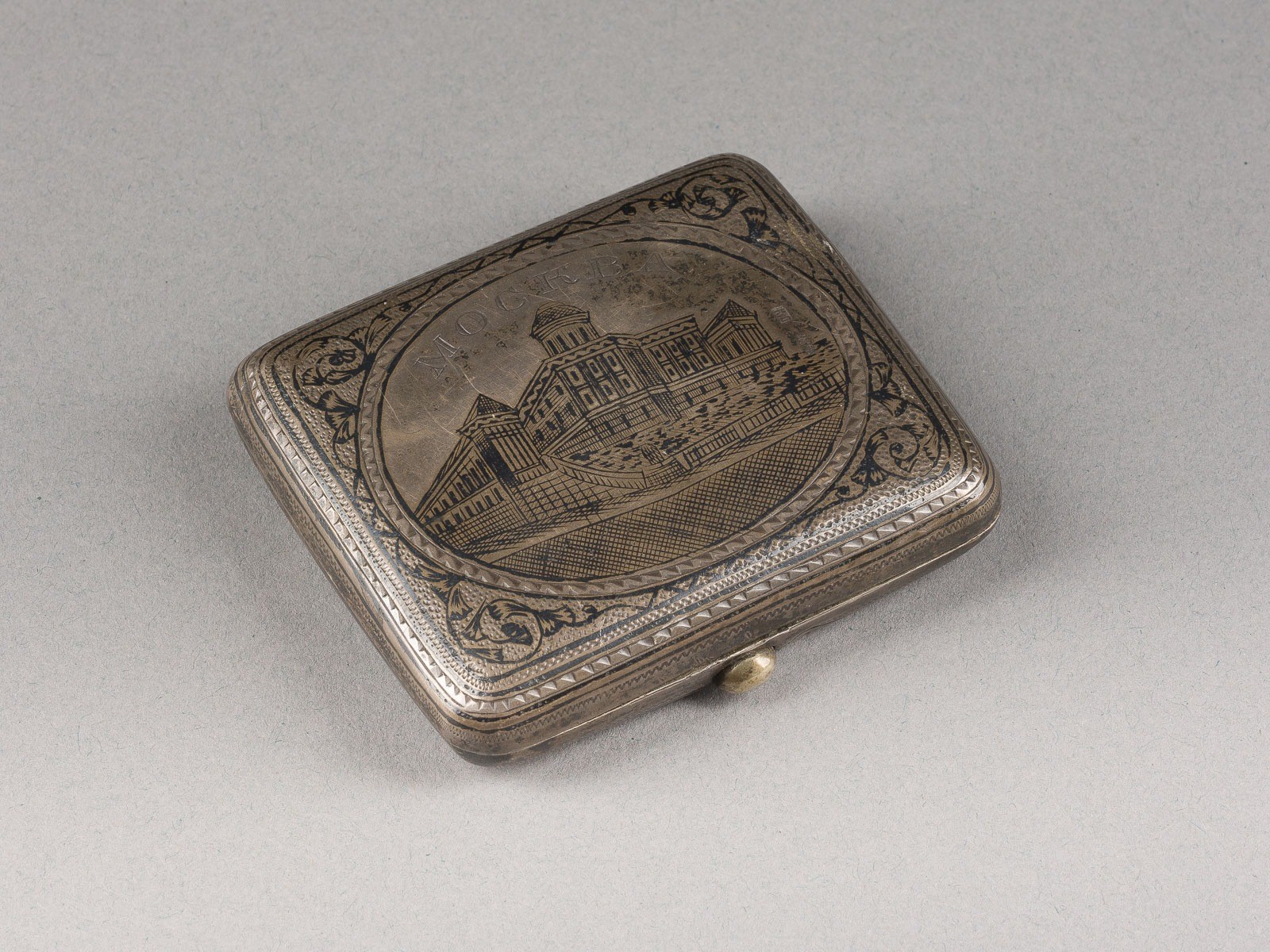 A SILVER AND NIELLO SNUFFBOX 'MOSCOW' Russian, Moscow, 1896-1908 Of rectangular form. The hinged lid with architectural view of Moscow. Marked with assayer's mark, 84 standard and master's mark 'K.B' in Cyrillic. Minor dents. 7 cm long, 78 gr.