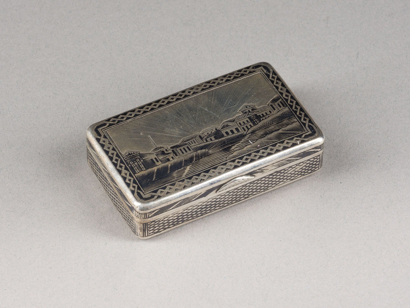 A SILVER AND NIELLO SNUFF BOX WITH AN ARCHITECTURAL VIEW OF ST. PETERSBURG Russian, Moscow, 1865 Of rectangular form. The hinged lid with architectural view. Marked with city hallmark, assayer's mark, 84 standard and master's mark 'II' in Cyrillic. 6.8 cm long, 72 gr.