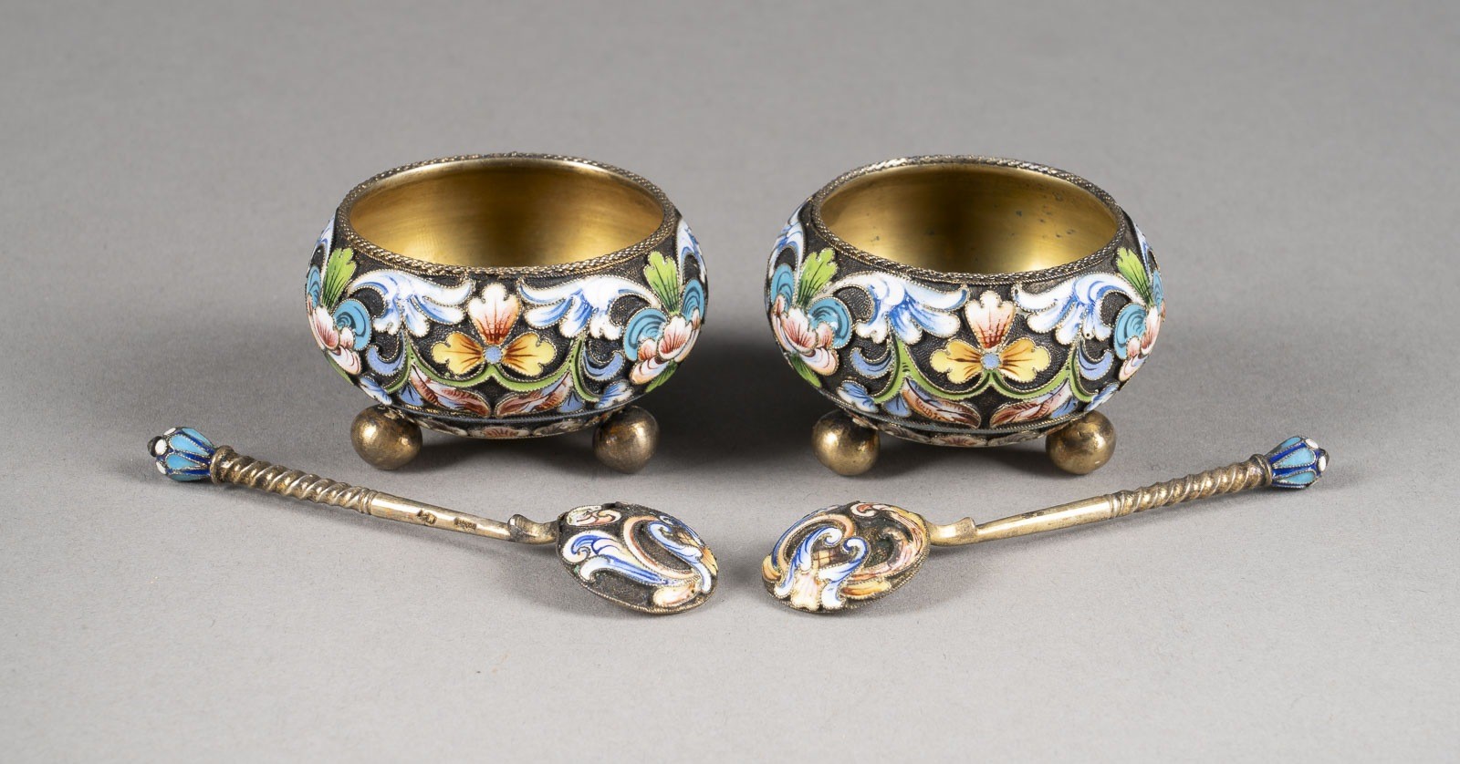 PAAR CLOISONNÉ-EMAIL-SALIÈREN MIT LÖFFELN