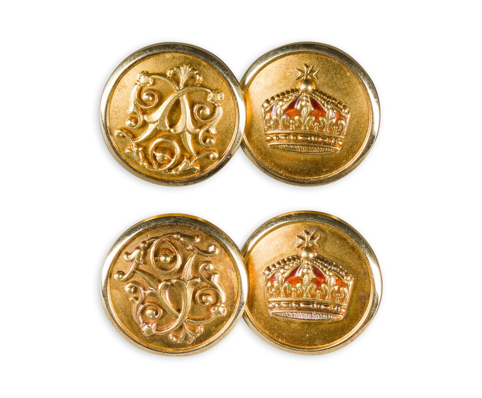 A PAIR OF CUFFLINKS 'PRINCE FERDINAND I OF BULGARIA (1861-1948)' IN ORIGINAL CASE Bulgarian, early 20th century 585 gold, red translucent enamel. Struck with 585 standard mark. Diameter 1.6 cm, 10 gr.