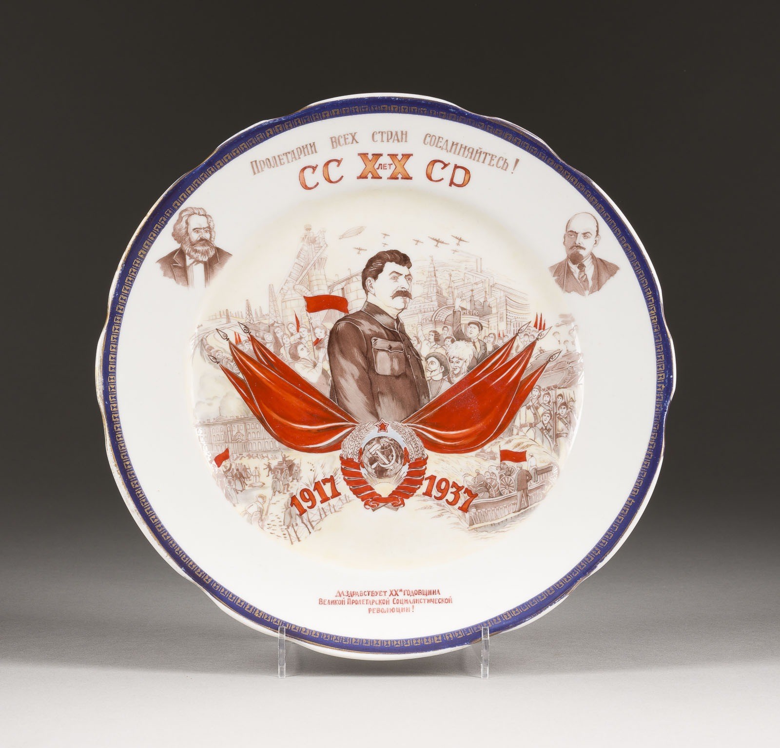 A PORCELAIN PROPAGANDA PLATE FOR THE 20TH ANNIVERSARY OF THE REVOLUTION Soviet Union, Dulyovo Porcelain factory, 1937 Painted. On the bottom red factory mark and inscr. 'A.P.'. Edges min. rubbed. Diam. 24.2 cm.