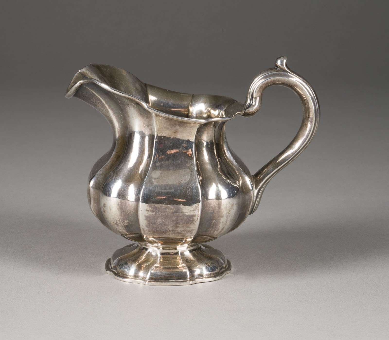 A SILVER CREAM JUG Russian, St. Petersburg, 1861 Gilt interior. Marked under base with city hallmark, assayer's mark, 84 standard and master's mark 'KK'. Later Polish control marks. Minor dents. 11.4 cm high, 188 gr.