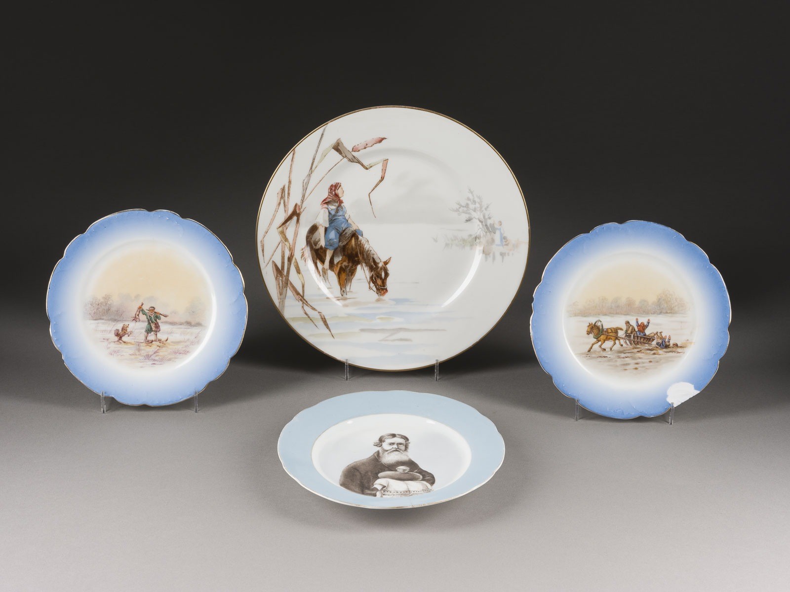 A COLLECTION OF FOUR PORCELAIN PLATES DEPICTING RURAL SCENES Russian, St. Petersburg/Riga/Verbilki, Kornilov Porcelain Factory/M.S.Kuznetsov Porcelain Factory, 1864-1917 Lithography/painted, with gilded rims. Each with factory mark, one plate on the bottom in Cyrillic inscr. 'After orig. drawing of N.Karazin. Reproduction forbidden'. Edges part. rubbed, partially chipped. Diam. 17.9-24.7 cm.