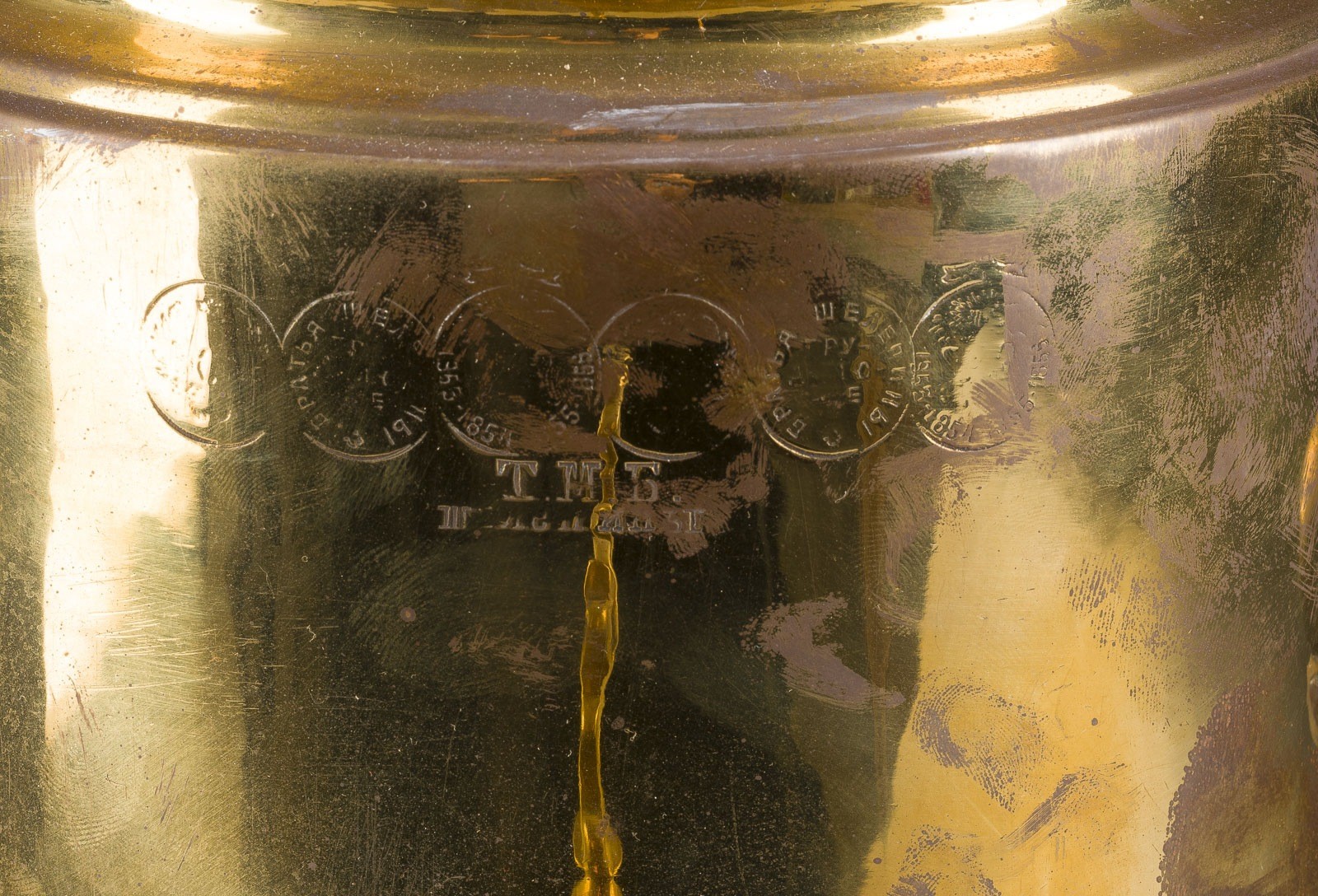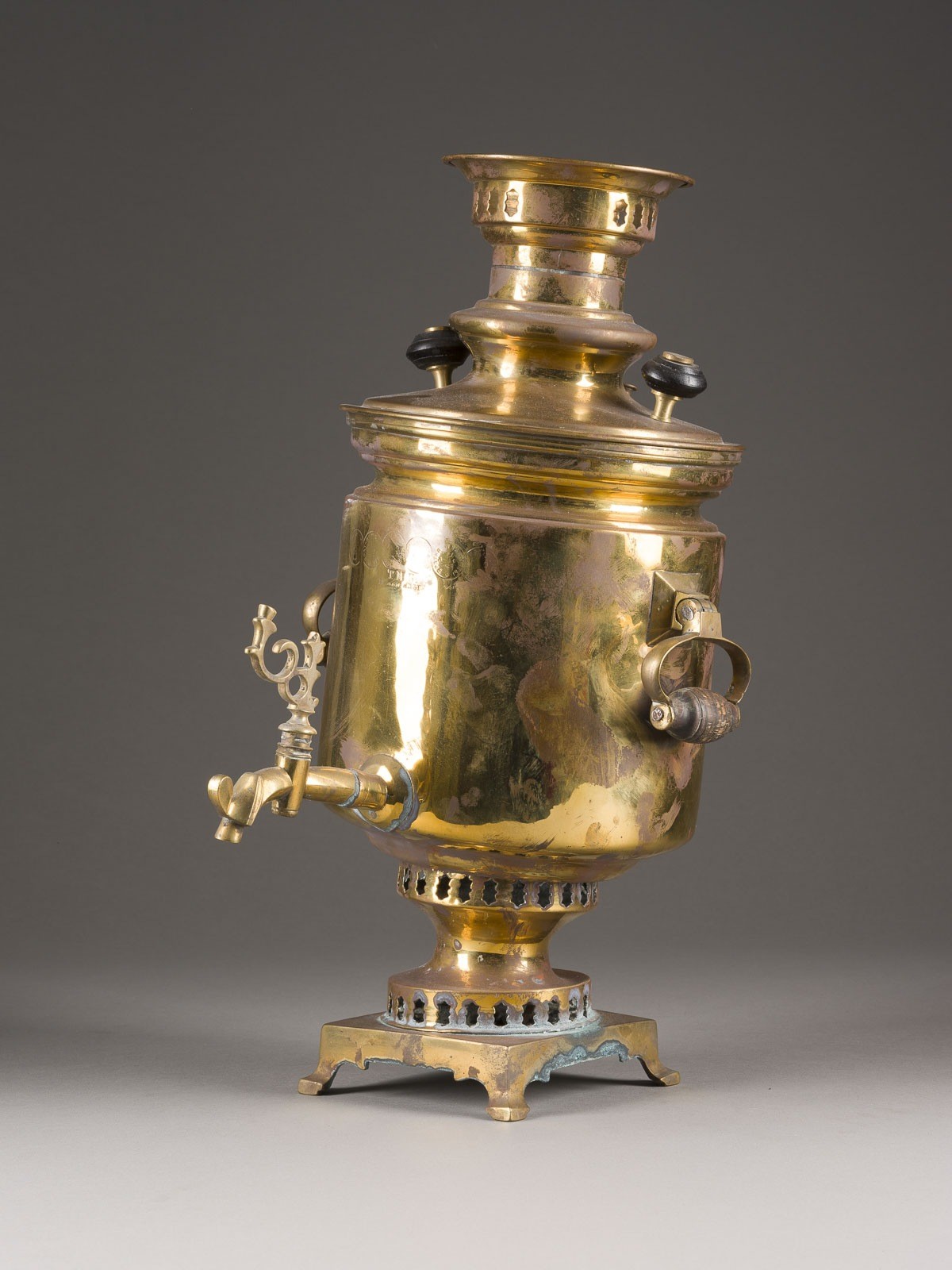 A BRASS SAMOVAR Russian, Tula, Shelepin Factory, 2nd half of 19th century The handles with wood diffusers and wood knops. Two Cyrillic factory marks with three medallions. Lower bent. 44.5 cm high.