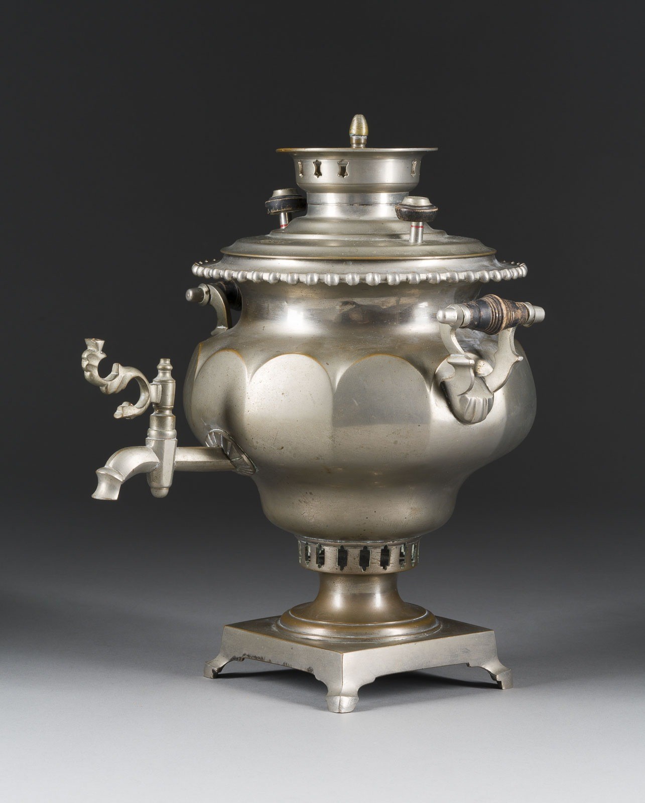 A BRASS SAMOVAR "VASE" Russian, Tula, N.A. Vorontsov Factory, late 19th century The handles with wood diffusers and wood knops. Cyrillic factory mark with a double-headed eagle. 29.3 cm high.