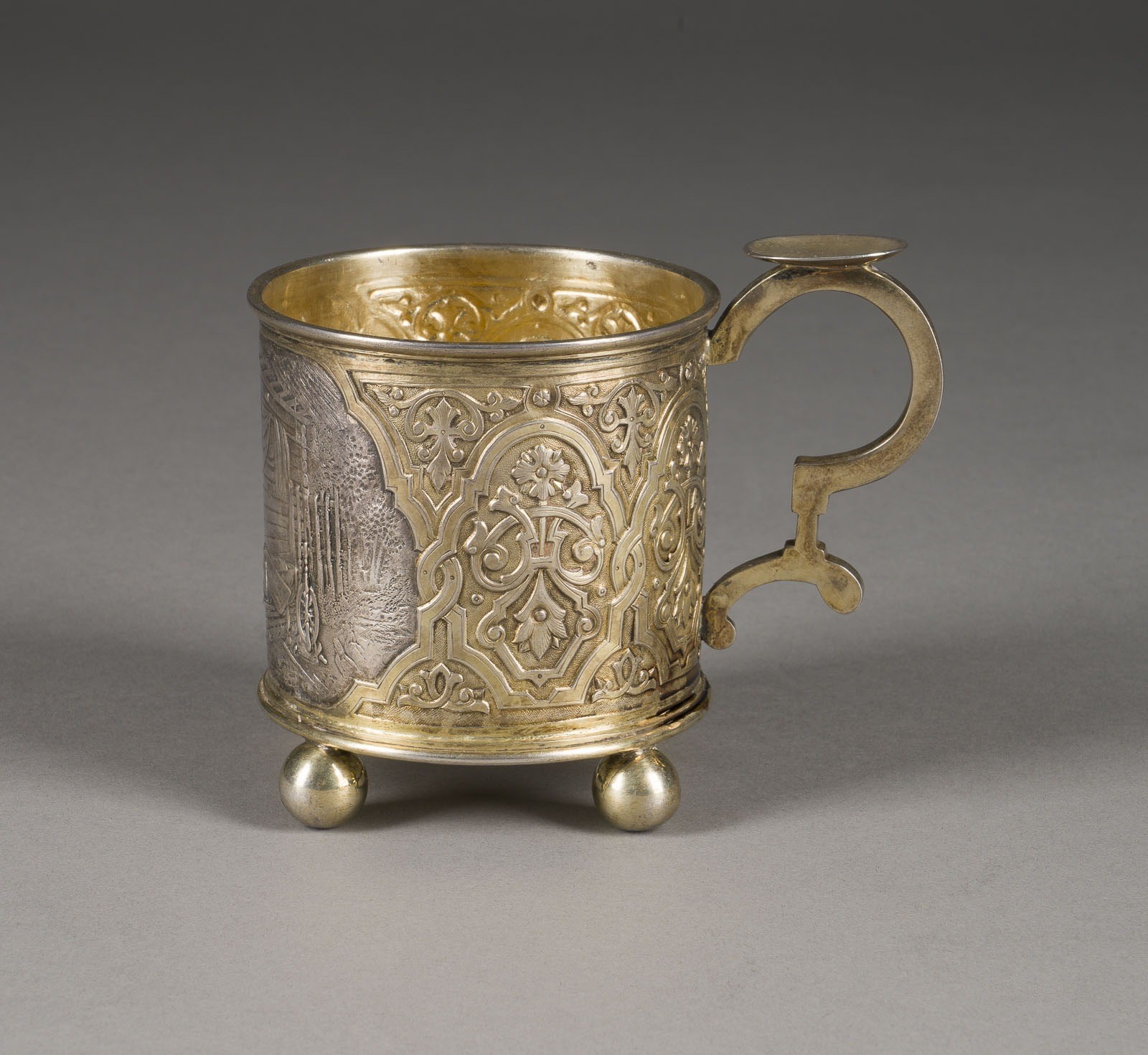 A VERY FINE SILVER AND PARCEL-GILT TEA GLASS HOLDER 'THE SURPRISE' Russian, Moscow, Pavel Ovchinnikov, 1883 Silver, partly gilt, finely chased. Of very fine quality, the front wall decorated with a peasant woman asleep and a hunter approaching. Marked under base with city mark, assayer's mark, 84 standard, and maker's mark 'P. OVCHINNIKOV' in Cyrillic with Imperial warrant. 8.3 cm high, 174 gr.