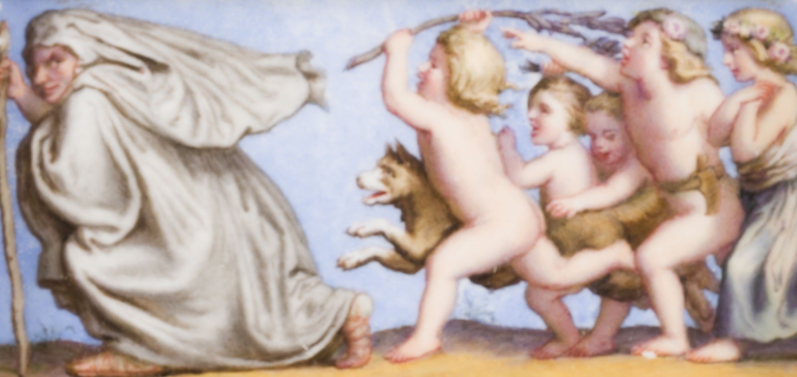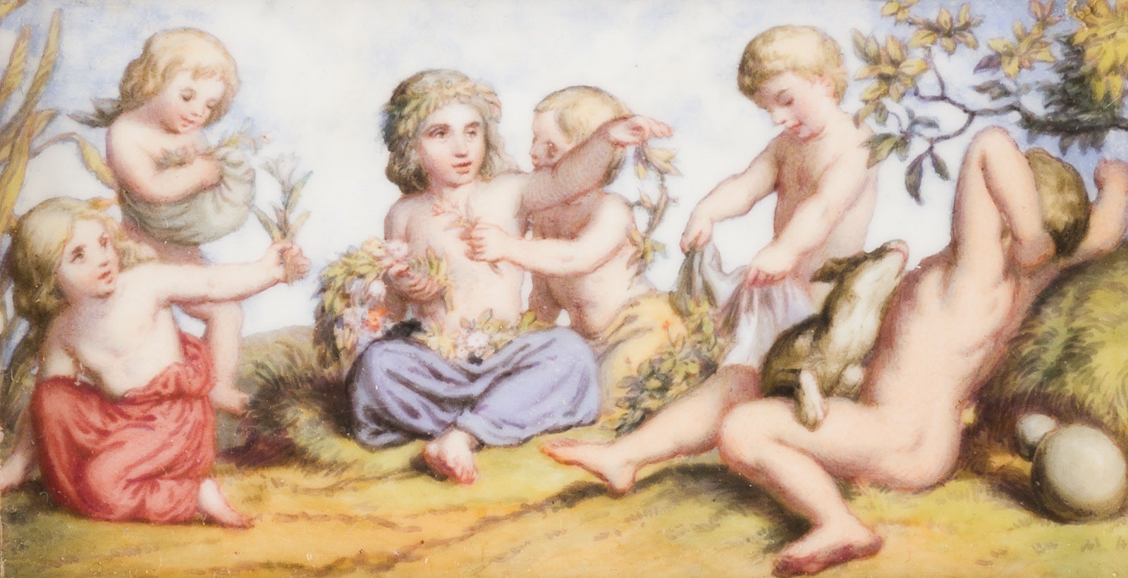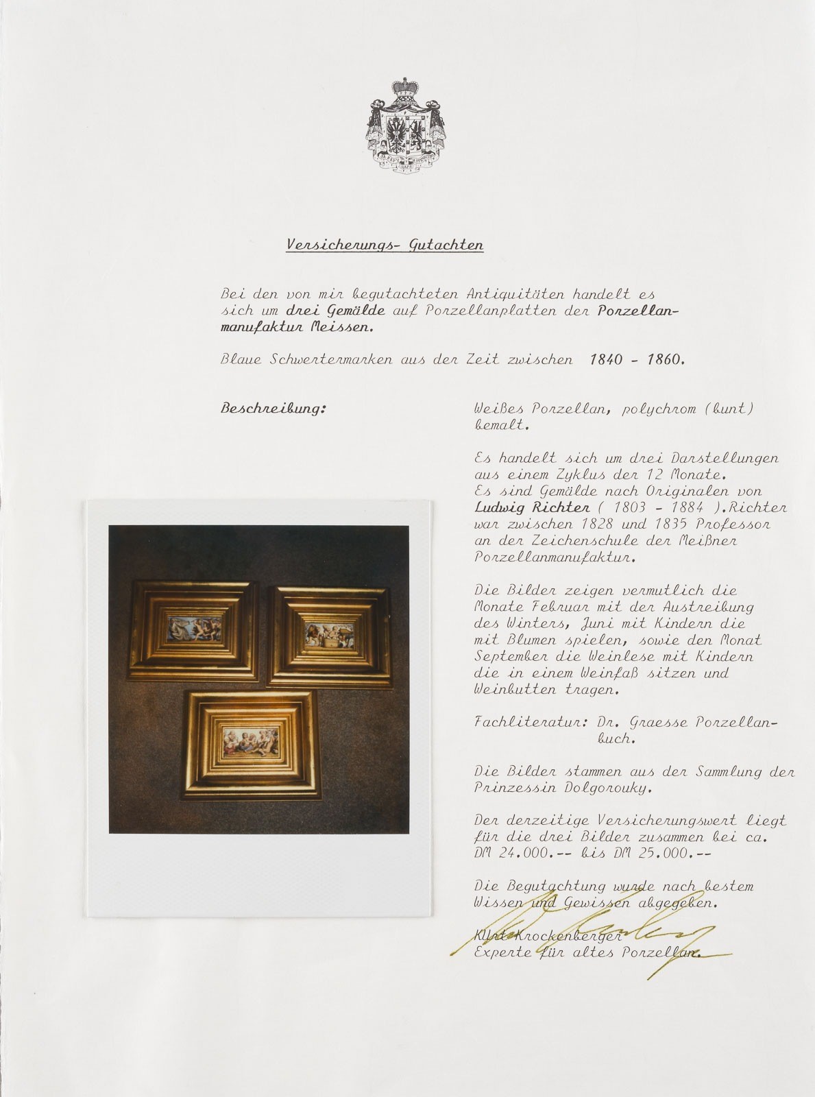 SEVEN PORCELAIN PLATES FROM THE 'TWELVE MONTHS' CYCLE FROM THE COLLECTION OF PRINCESS YOURIEVSKY German, Meissen, after paintings by Ludwig Richter (1803-1884), 1840-1860 Overglaze painting. Each approx. 6 x 11 cm (F. 22 x 26 cm). Underglaze blue mark with swords. The plates depict the months of January, February, March, May, June, September, and December with various children's scenes. Princess Catherine Yourievsky (born Ekaterina Dolgorukova) was the longtime mistress and later the second, morganatic wife of Tsar Alexander II. Following the Tsar's assassination in 1881 she lived much of her remaining life in exile in France and Switzerland, bringing with her personal belongings, including letters and mementos some of which reflected her life with the late Emperor. Expertise: Certificate from Mr. Kurt Krockenberger