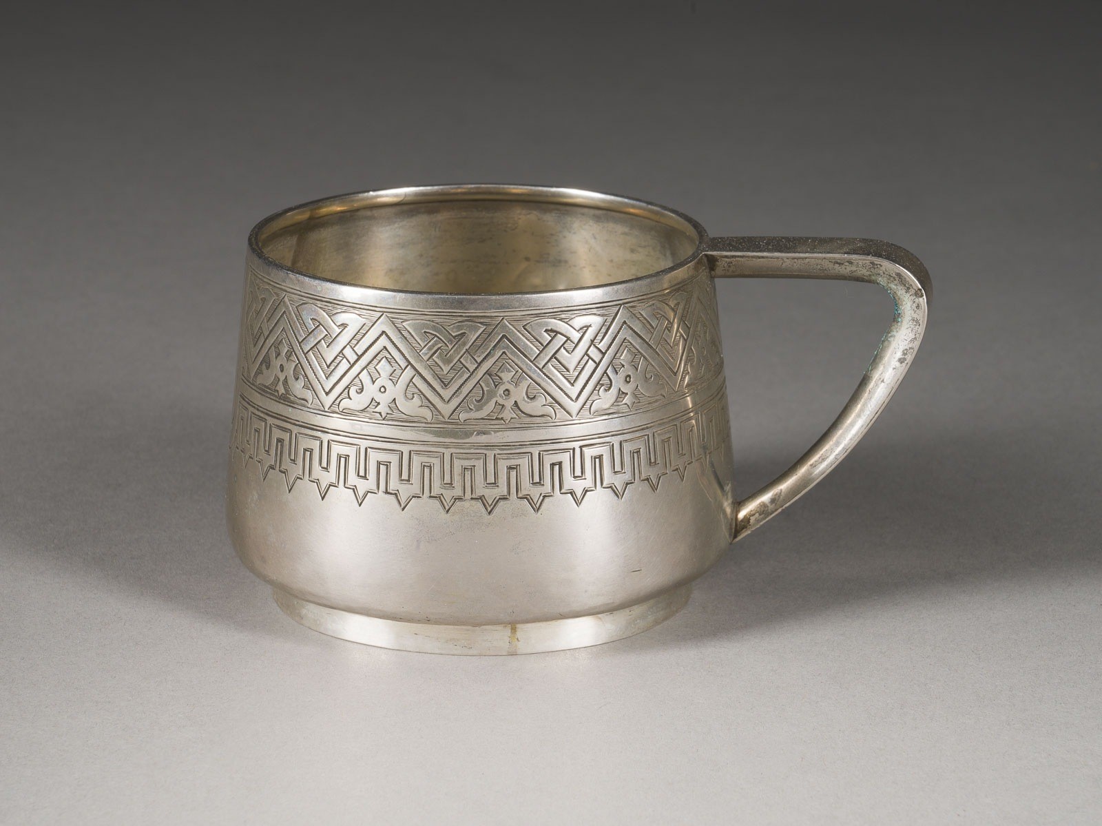 A SILVER TEAGLASS HOLDER OF PAN-SLAVIC DESIGN Russian, St. Petersburg, Gratchev Brothers, 1891 The body engraved with initials 'MR' in Cyrillic and date '18/IX 1891', sides engraved with geometric patterns. Marked under base with city hallmark, assayer's mark, 84 standard and master's mark 'GRATCHEV' in Cyrillic. Minor dents. 5.6 cm high, 112 gr.