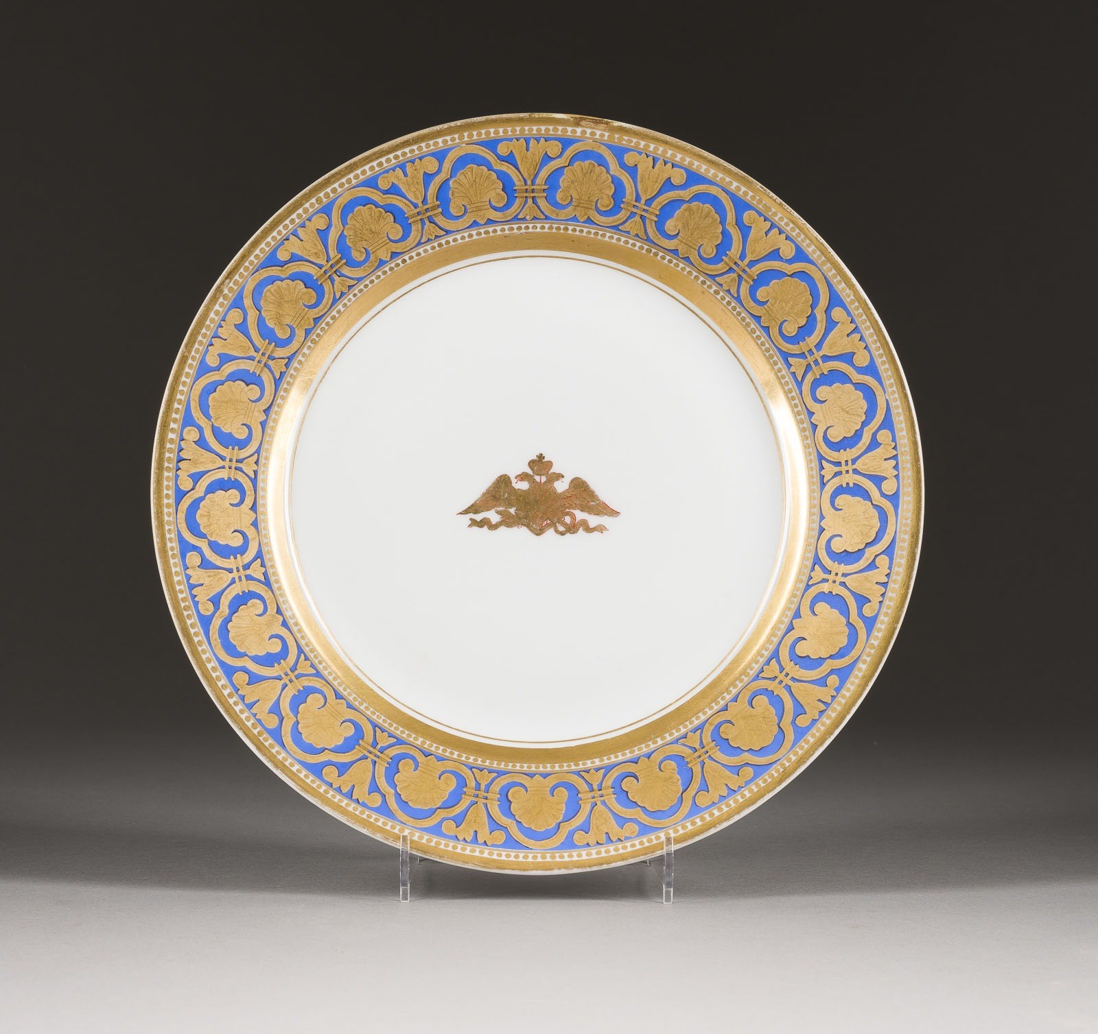 A PORCELAIN PLATE FROM THE PORSHA SERVICE Russian, St. Petersburg, Imperial Porcelain Factory, Period of Nicholas II, 1902 Gold painting. Underglaze green factory mark 'NII 1902' under the crown. At the edge rest., hairline crack. Diam. 24.4 cm.