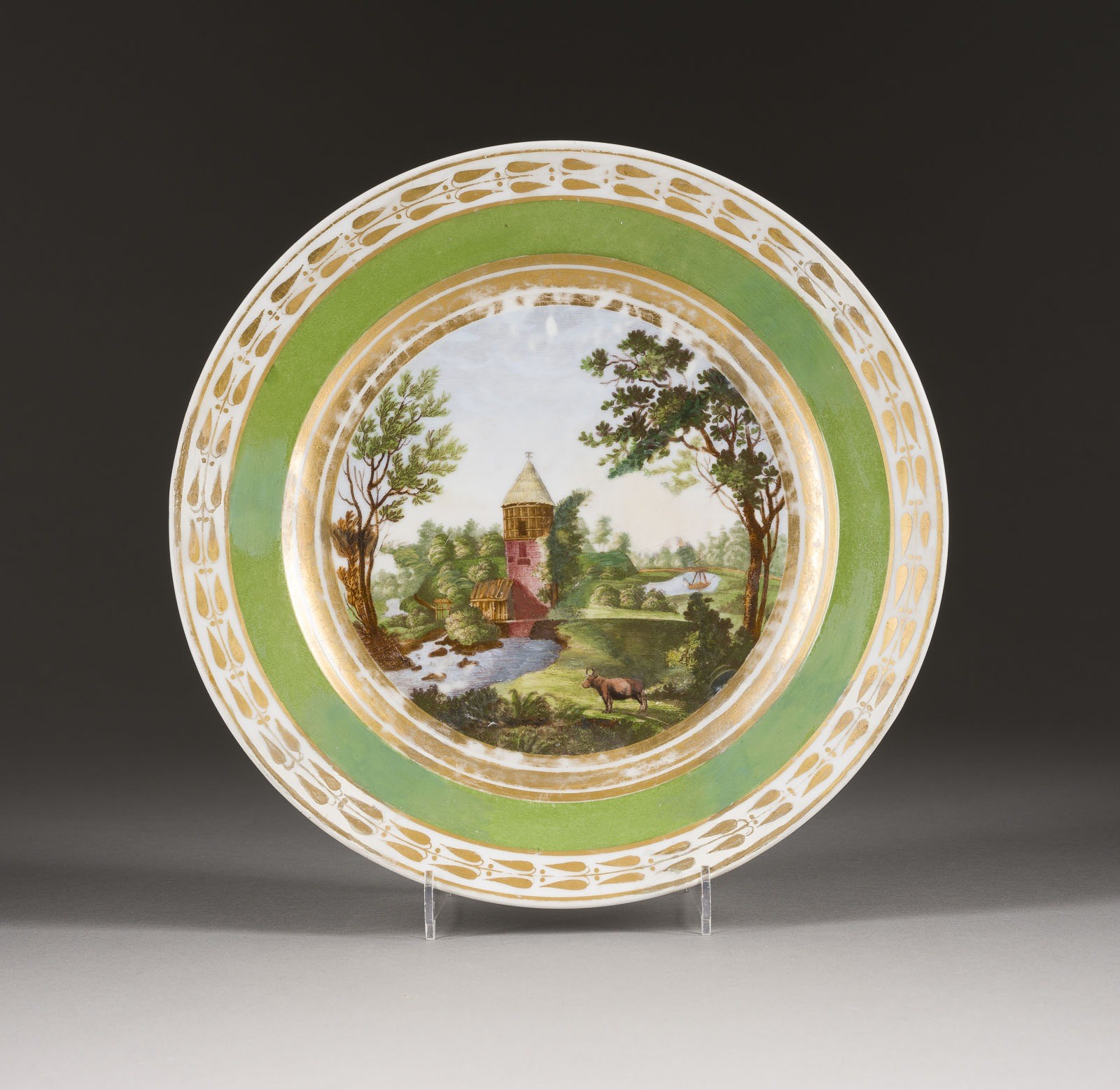 A PORCELAIN PLATE WITH A VIEW OF PART OF THE GARDEN IN PAVLOVSK Russian, St. Petersburg, Imperial Porcelain Manufactory, Period of Alexander I, 1820s Lithography, painted, gilded rims. Titled in Cyrillic on the bottom. Rest., gilding part. rubbed. Diam. 23.8 cm.