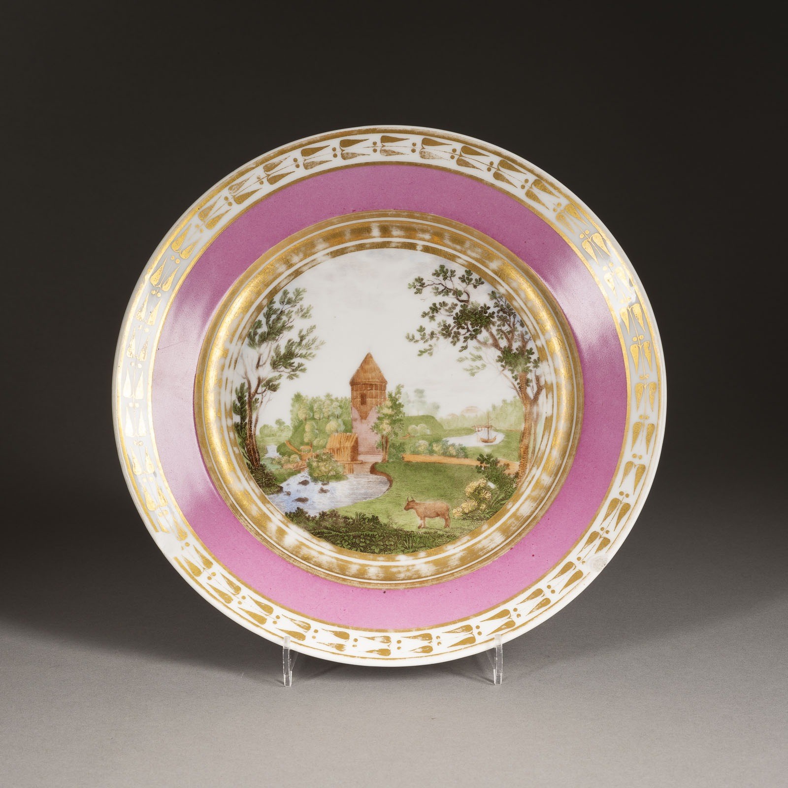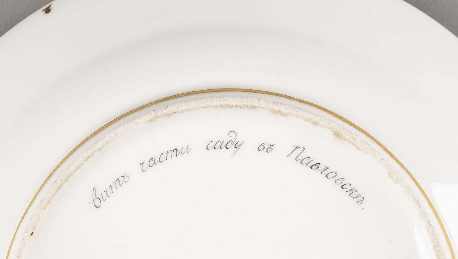 A PORCELAIN PLATE WITH A VIEW OF PART OF THE GARDEN IN PAVLOVSK Russian, St. Petersburg, Imperial Porcelain Manufactory, Period of Alexander I, 1820s Lithography, painted, gilded rims. Titled in Cyrillic on the bottom. Partially chipped, gilding part. rubbed. Diam. 23.7 cm.