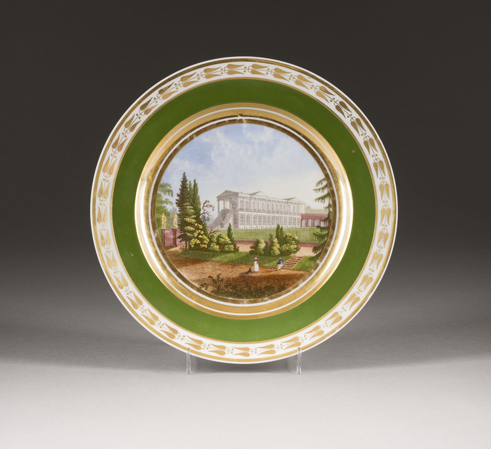 A PORCELAIN PLATE WITH A VIEW OF THE COLONNADE IN THE TSARSKOYE SELO GARDEN Russian, St. Petersburg, Imperial Porcelain Manufactory, Period of Alexander I, 1820s Lithography, painted, gilded rims. Titled in Cyrillic on the bottom. Min. rubbed. Diam. 23.5 cm.