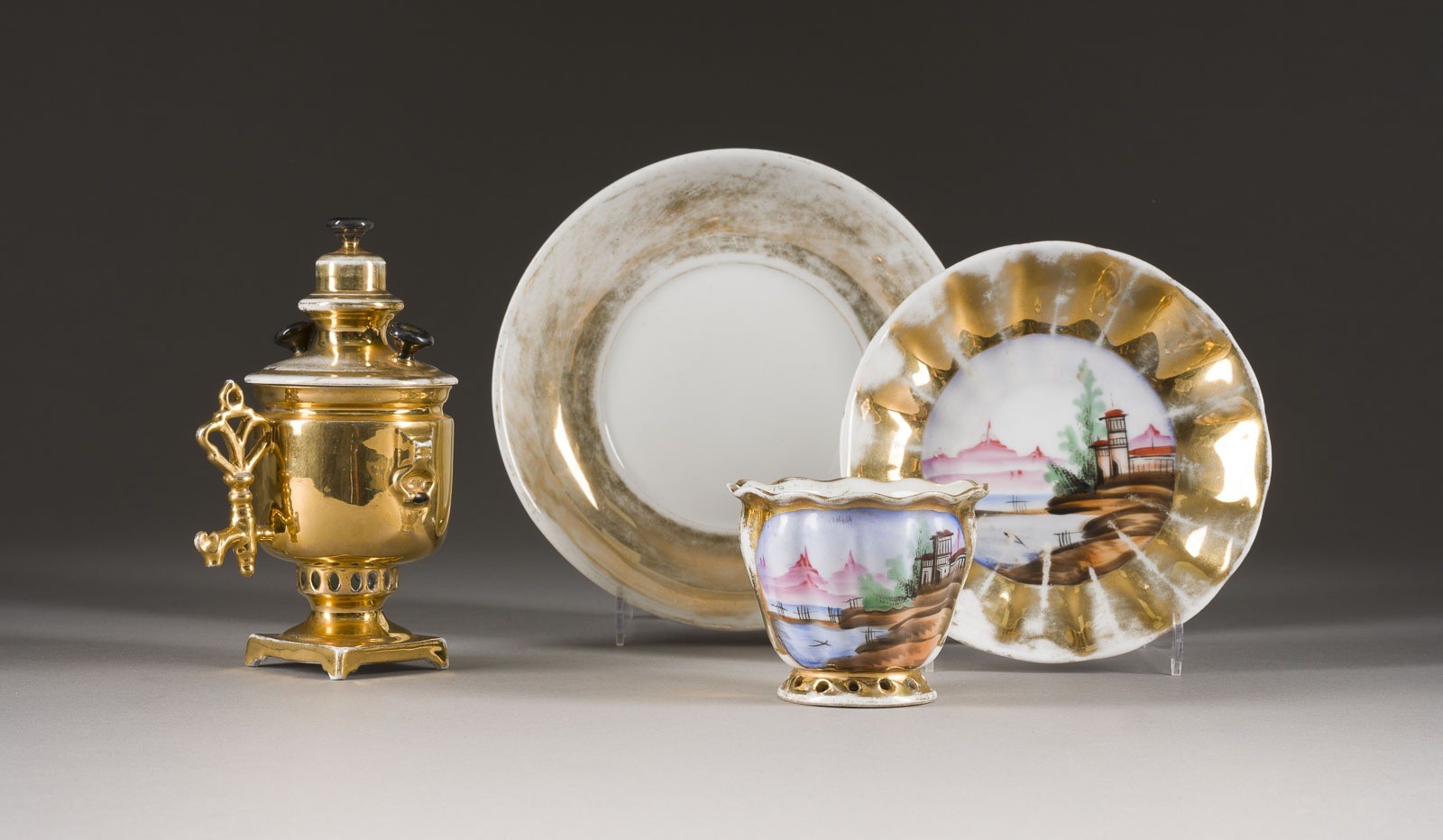 FOUR-PIECE PORCELAIN TEA SERVICE Russian, Dulyovo, M.S. Kuznetsov Porcelain Factory, 1864-1889 Gilded, partially painted. Overglaze blue factory mark. Gilding part. rubbed. Diam. 14.7/17.2 (plates), 6.7/15.5 cm high (cup/samovar).