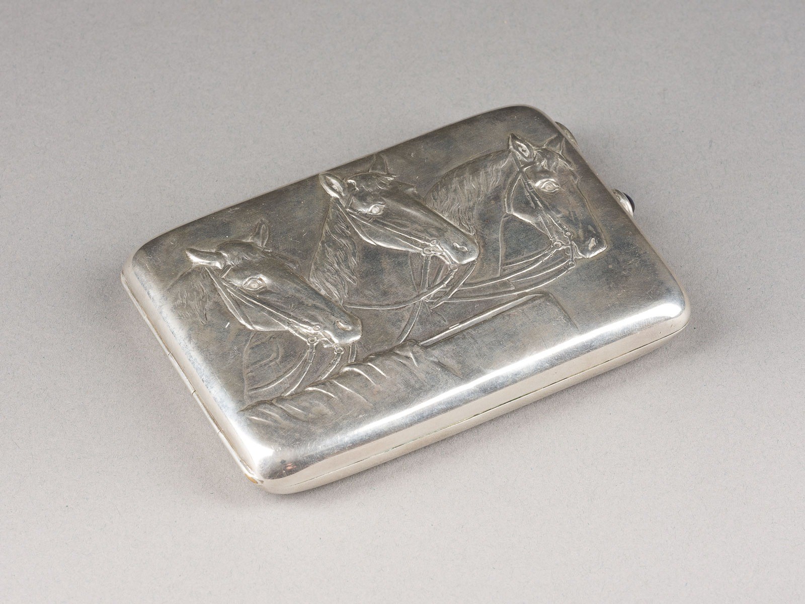 A SILVER CIGARETTE CASE DEPICTING THREE HORSES Soviet Union, Moscow, 1927-1954 Of rectangular form. The cover repoussé and chased. Marked with assayer's mark, 875 standard and master's mark. 11.2 cm long, 155 gr.