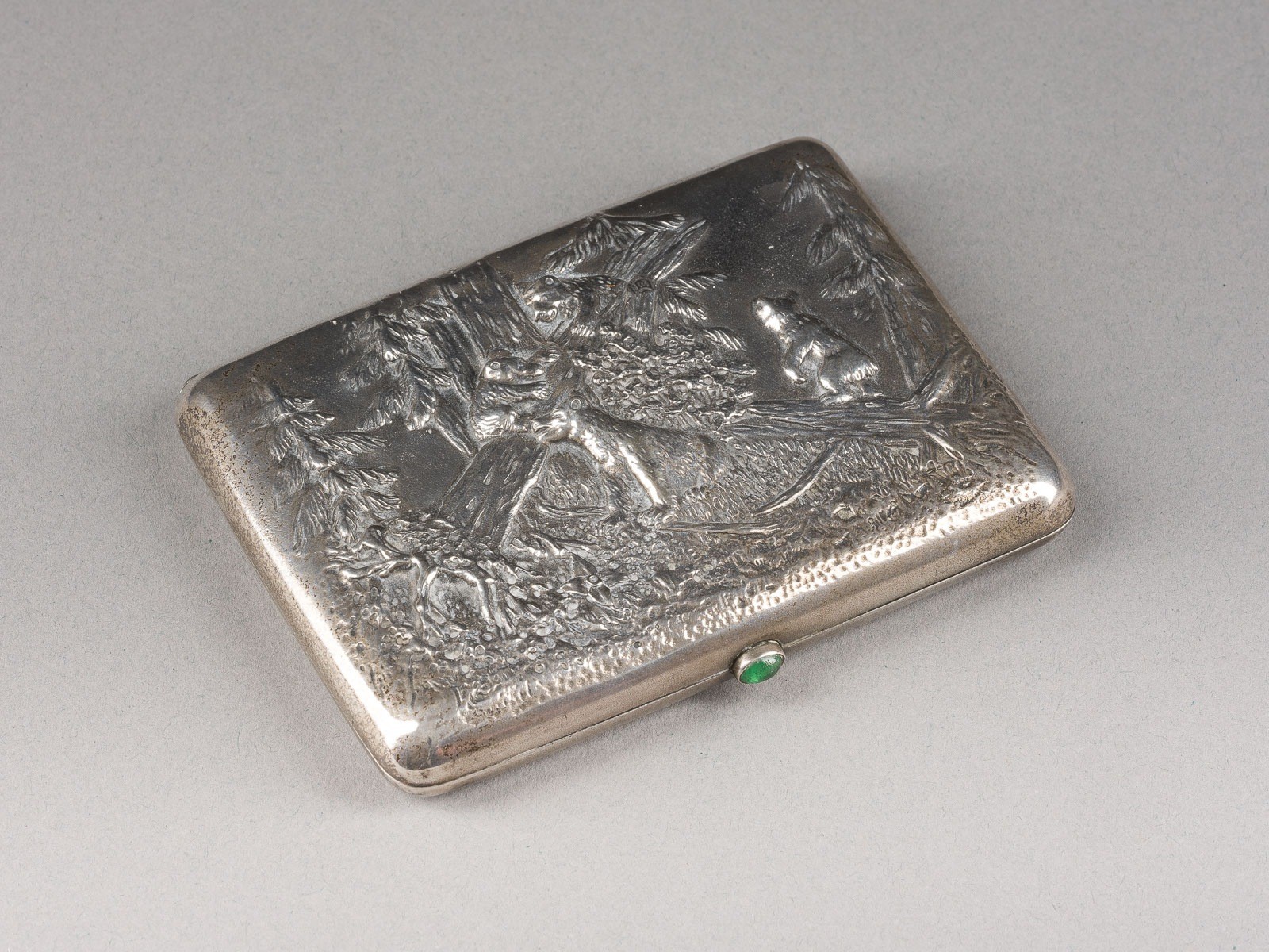 A SILVER CIGARETTE CASE Russian, Moscow, 1908-1917 Cover chased in relief with 'Morning in a Pine Forest' after Ivan Shishkin. Gilt interior. With a green cabochon-set thumbpiece. Marked with assayer's mark, 84 standard and master's mark 'IK' in Cyrillic. 10.3 cm long, 179 gr.