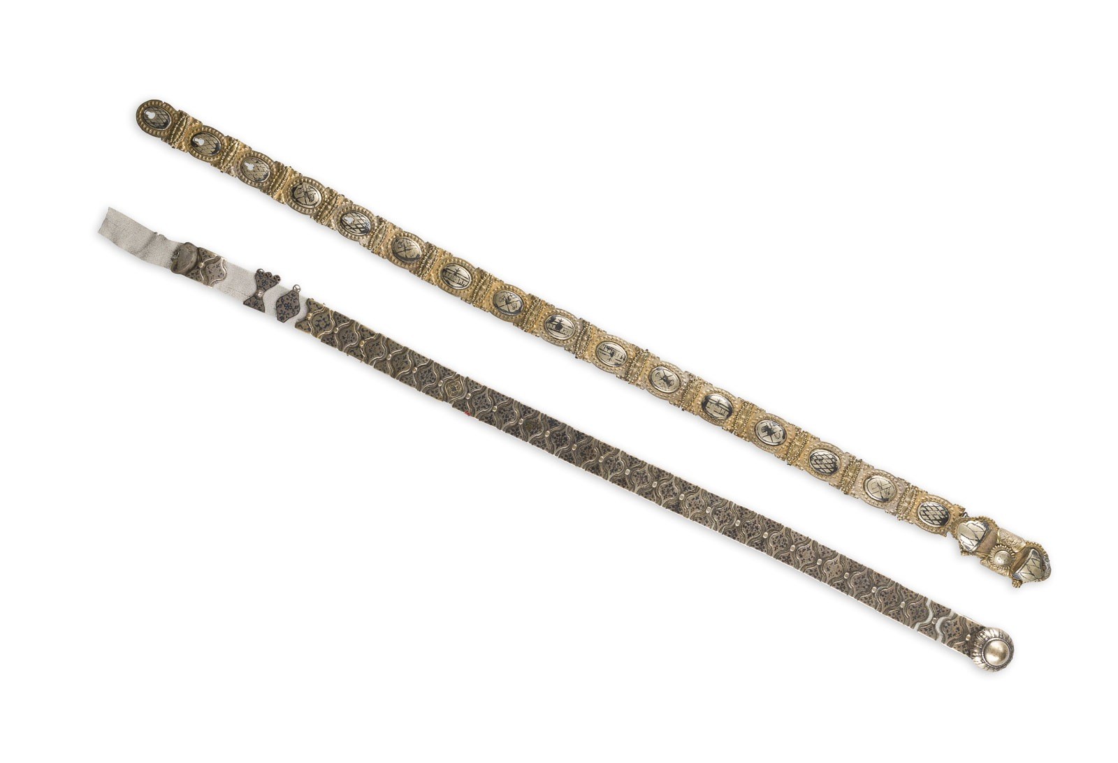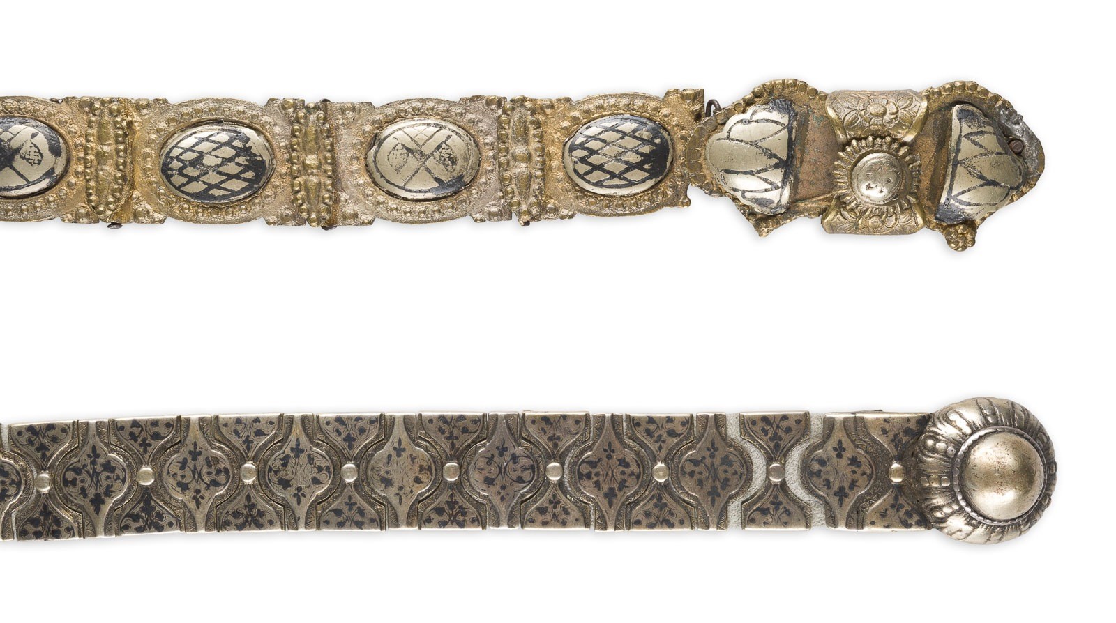TWO NIELLO BELTS Among others Russia, Moscow, 1877 Silver / brass, niello. Struck with city mark, assayer's mark, 84 standard and maker's mark. Minor damages. 79 / 87 cm long, 480 g (silver belt with leather strap).