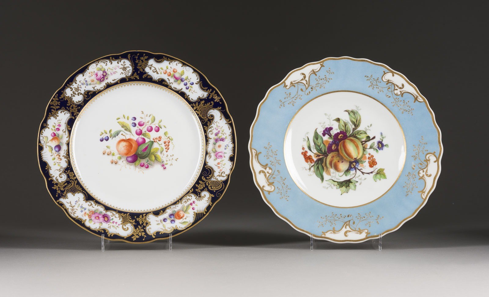 TWO PORCELAIN FRUIT PLATES Russian, St. Petersburg, Imperial Porcelain Factory, Period of Nicholas I, 1825-1855 Painted, with gilded rims. Each with blue factory mark 'NI' under the crown and stamps, one plate inscr. on the bottom 'N. I. T'. One plate on the bottom chipped. Diam. 24.5/25 cm.