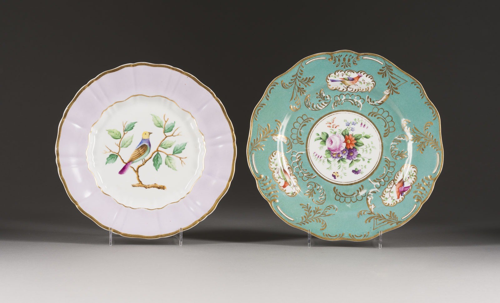 TWO PORCELAIN PLATES WITH BIRDS Russian, St. Petersburg, Imperial Porcelain Factory, Period of Nicholas I, 1825-1855 Painted, with gilded rims. Each on the bottom with blue factory mark 'NI' under the crown, one plate with stamp '10'. Gilding min. rubbed. Diam. 21.4/23.5 cm.