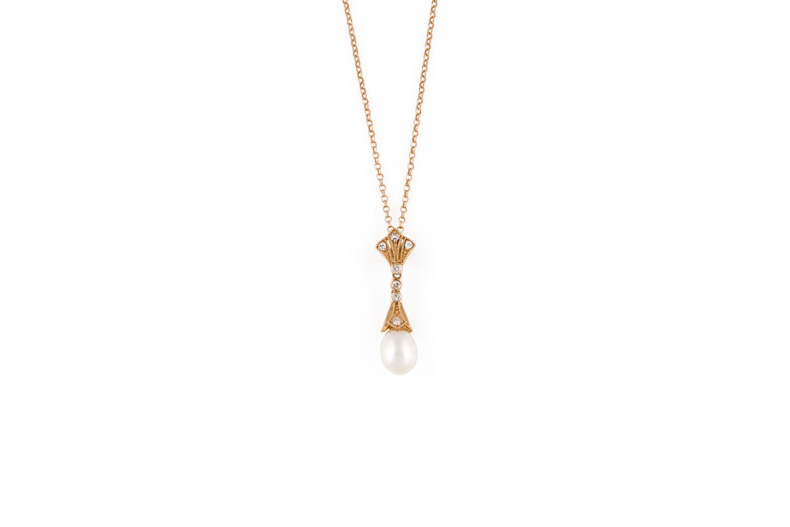 RG 585. Ges.-Gew.: ca. 7,5 g. Schmuckset, bestehend aus einem Paar Ohrhängern und einem Anhänger an Collier im Art Déco