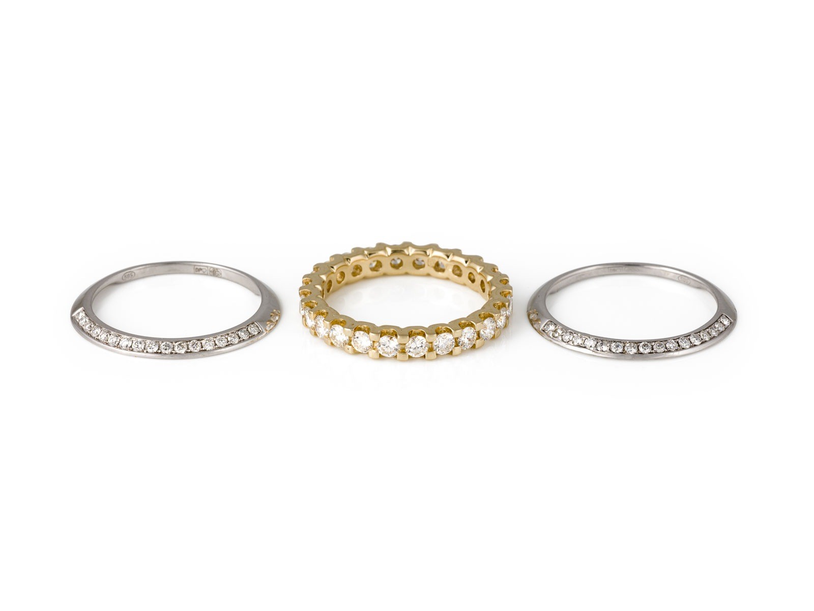 WG/GG 585. Ringmaß: ca. 58. Ringbreite: ca. 6,4 mm. Ges.-Gew.: ca. 7,3 g. 3-Teiliges Ring-Set, bestehend aus zwei Halbmemoire-Vorsteckringen in WG und einem