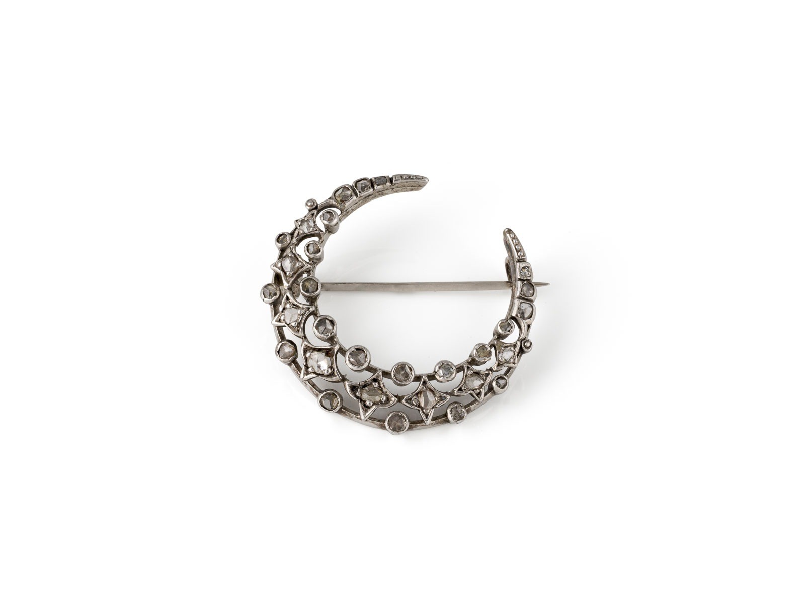 AG,WG 585. Maße: ca. 31,3 mm x 29,2 mm. Ges.-Gew.: ca. 5,6 g. Antike Halbmond Brosche, besetzt mit Rosendiamanten zus. ca. 0.20 ct.