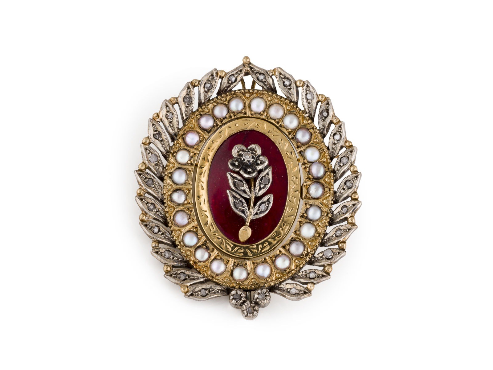 AG/GG 750 (getestet). Ca. 45,0 x 37,0 mm. Ges.-Gew.: ca. 25,8 g. Brosche besetzt mit Zuchtperlen, Diamantrosen und 1 Diamanten im 8/8-Schliff. Zentrales