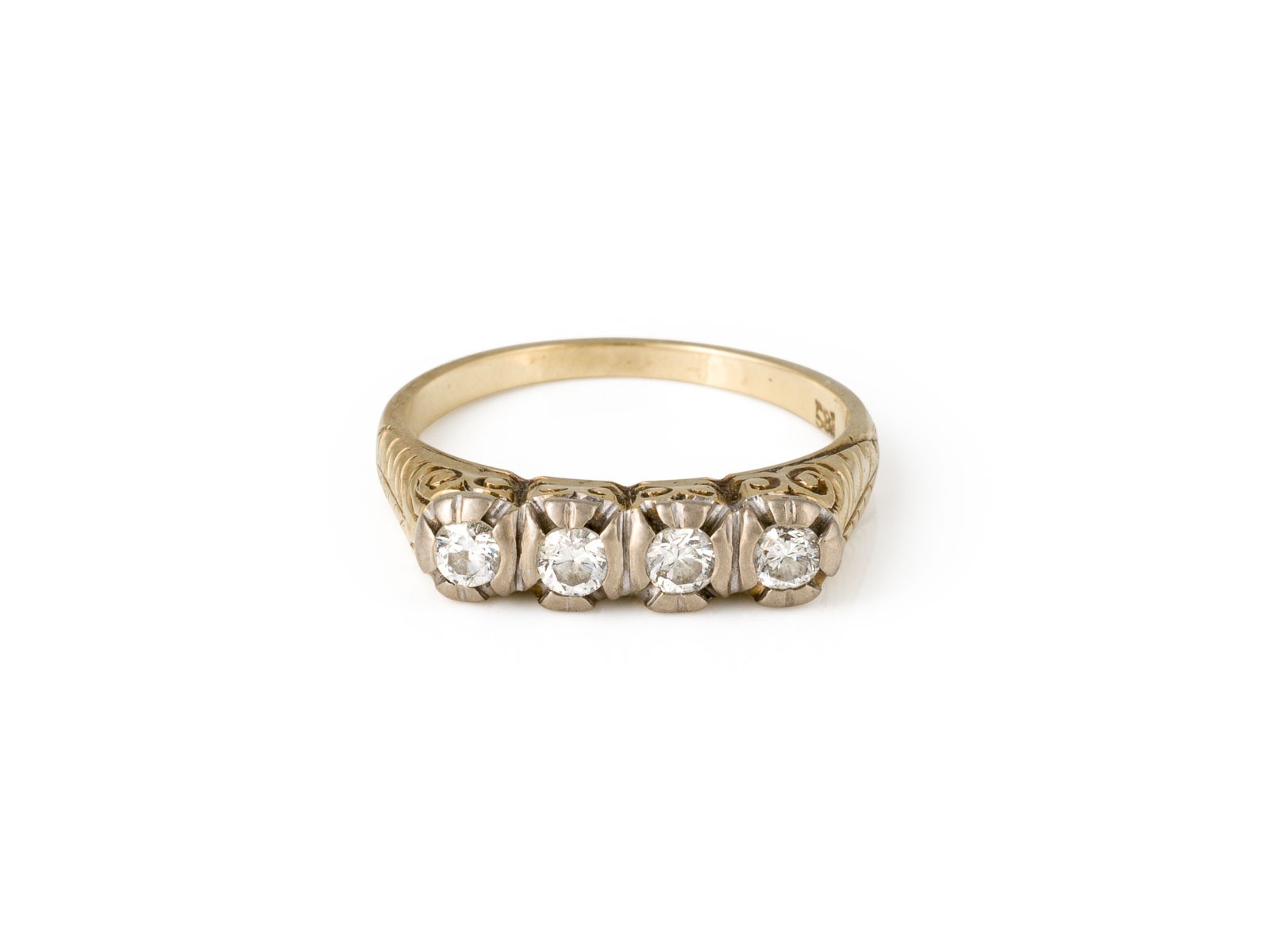 GG 585. Ringmaß: ca. 56. Ringbreite: ca. 4,7 g. Ges.-Gew.: ca. 4,7 g. Antiker Ring, besetzt mit 4 Diamanten zus. ca. 0.20 ct. H-J/SI-P.