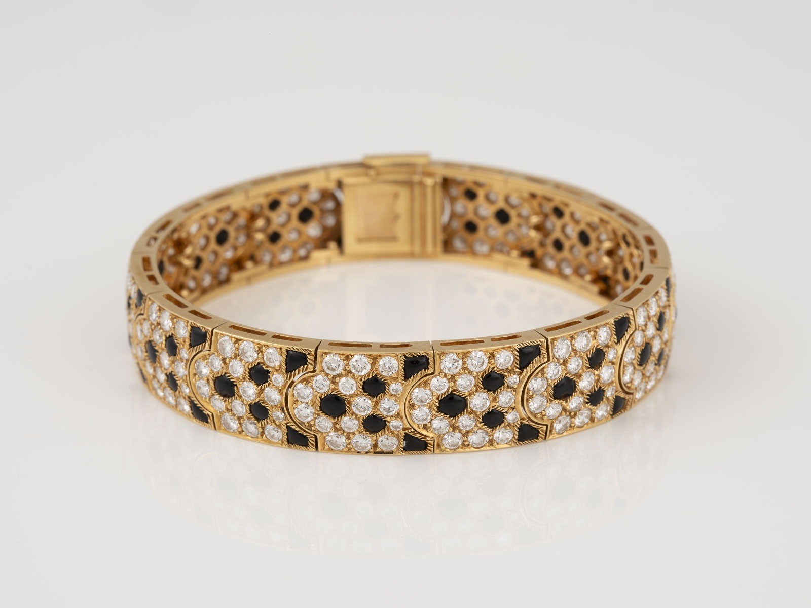 Gelbgold. Innen-D. ca. 5,5 cm, Ges.-Gew. ca. 37 g. Gest. 750, französische Marke 'Adlerkopf', Herstellersignet, nummeriert. 74 Onyxplättchen, 240 Brillanten, zusammen ca. 7,10 ct. Part. besch. Ein Onyxstein fehlend.