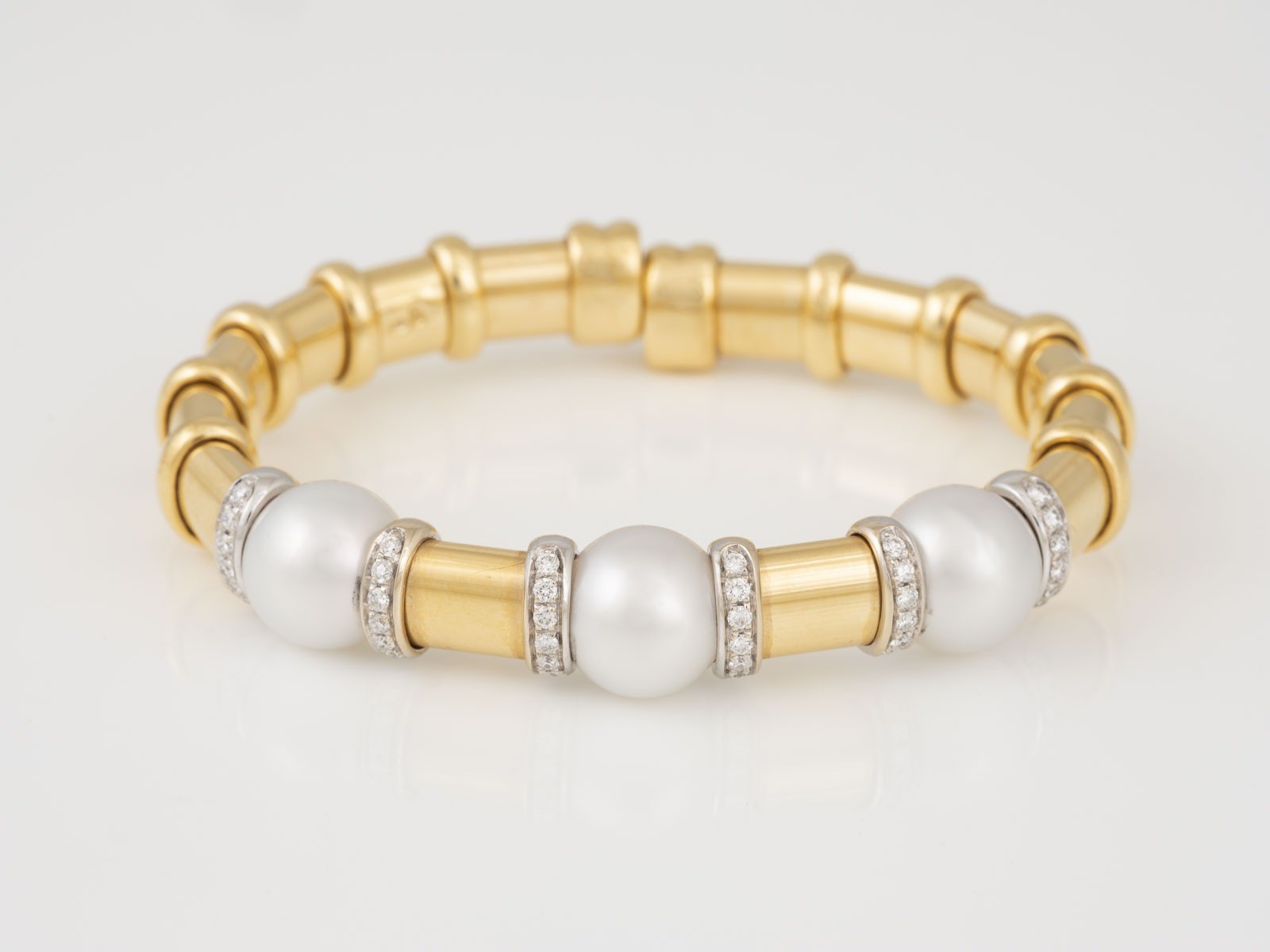Gelbgold, Weißgold. Innenmaß ca. 6,0 x 4,5 cm, Ges.-Gew. ca. 60,9 g. Gest. 750, Herstellersignet. Offen gearbeiteter Reif (wohl flexibles Innenband aus Metall) mit drei Perlen, D. ca. 12,0