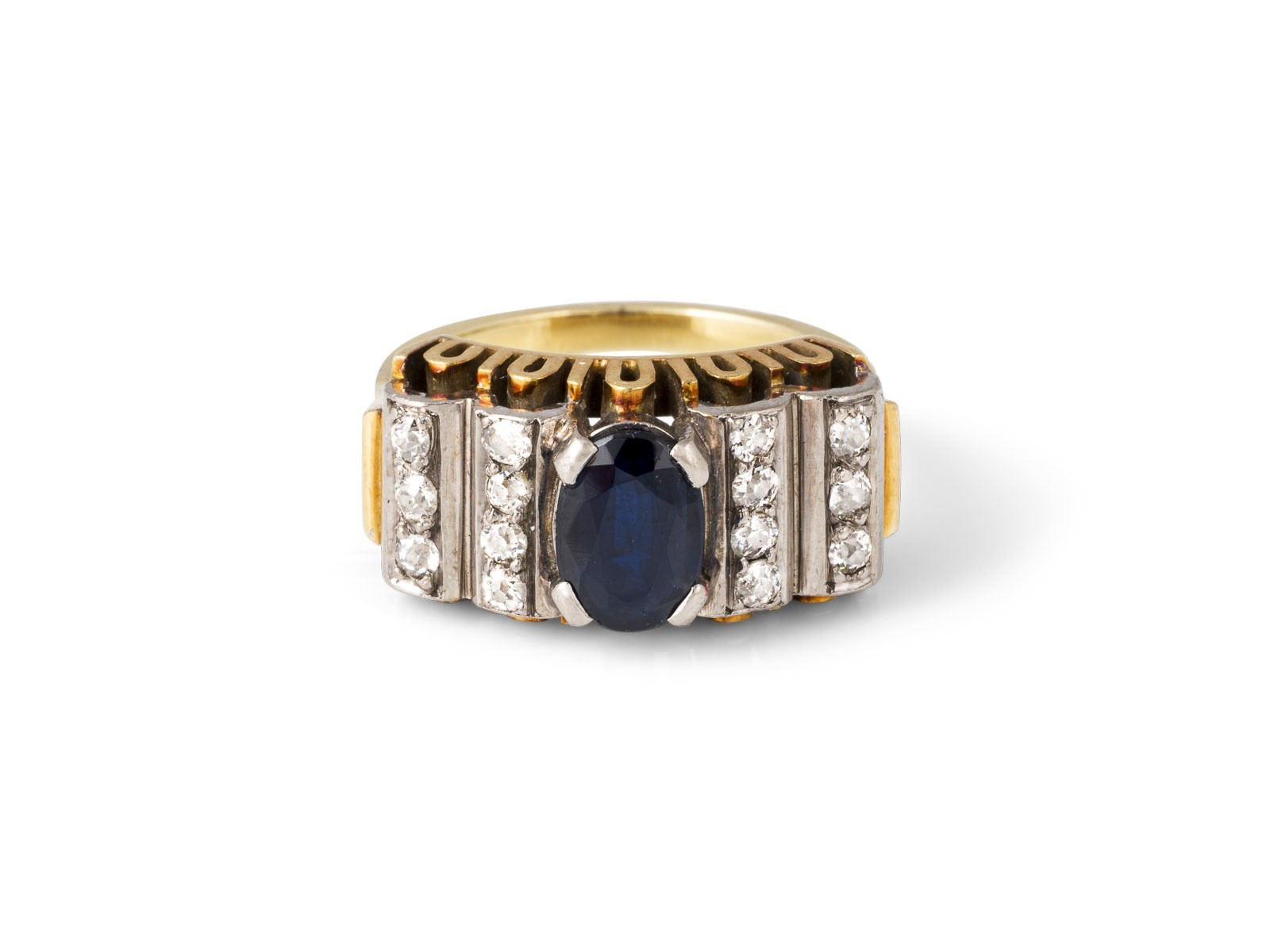 WG/GG 585. Ringmaß: ca. 52. Ringkopfmaße: ca. 19,3 mm x 10,1. Ges.-Gew.: ca. 7,5 g. Art Déco Ring mit einem zentralen, oval facettierten Saphir von ca. 1.15 ct. und